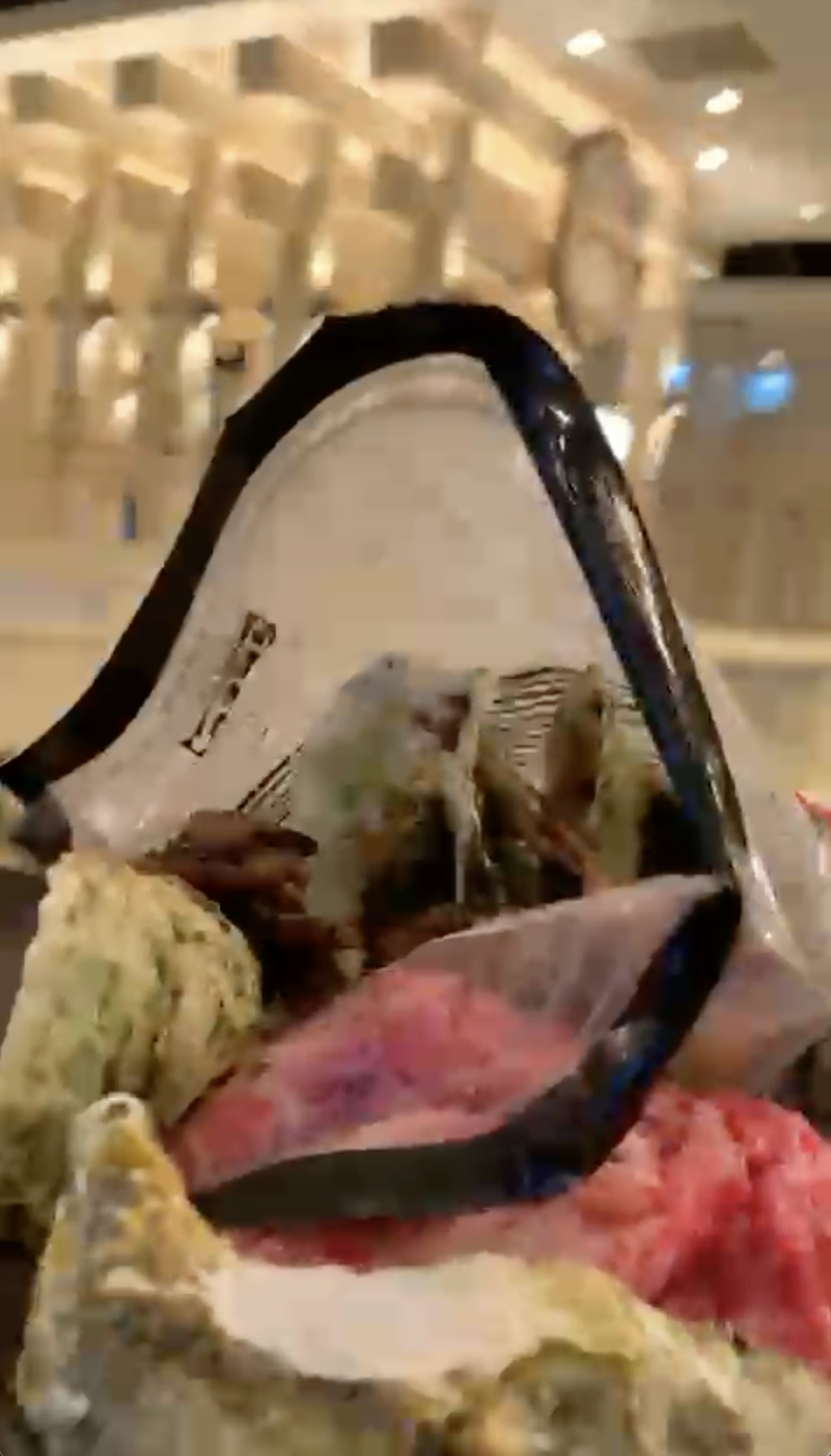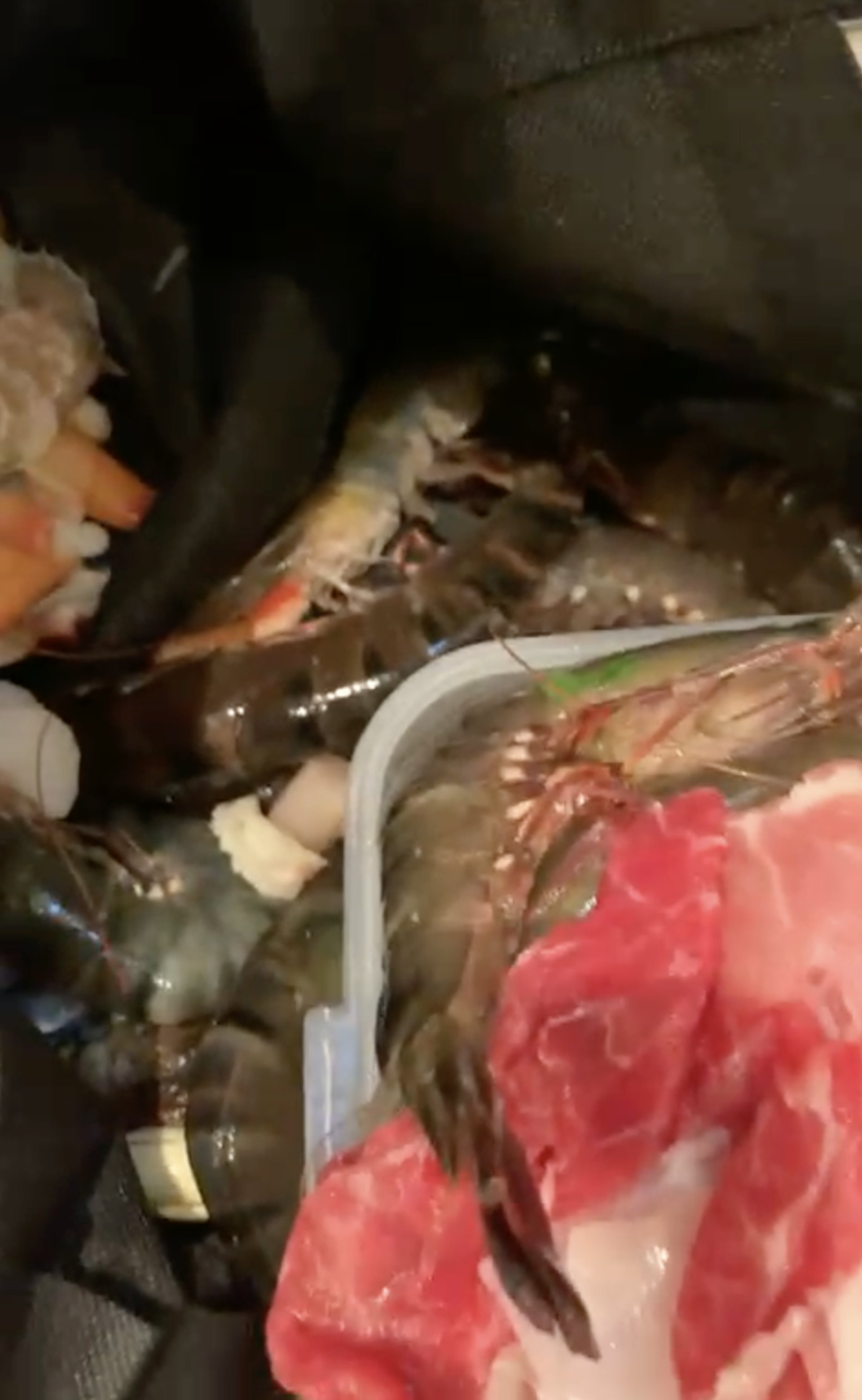 4 |' j7 A, S% s* K3 k職員隨後以托盤將食材全部取走,放在一輛推車上檢查,驚揭整袋均是食材,遂匯報並記錄事件,「啱啱向A49,見到個客盜取比較多嘅食材拎走」。鏡頭所見,盜取的食材以一個大膠盒裝載,包括蝦、生蠔、鮑魚、蟹、魚片、肥牛,部分鮮蝦仍然生猛郁動。