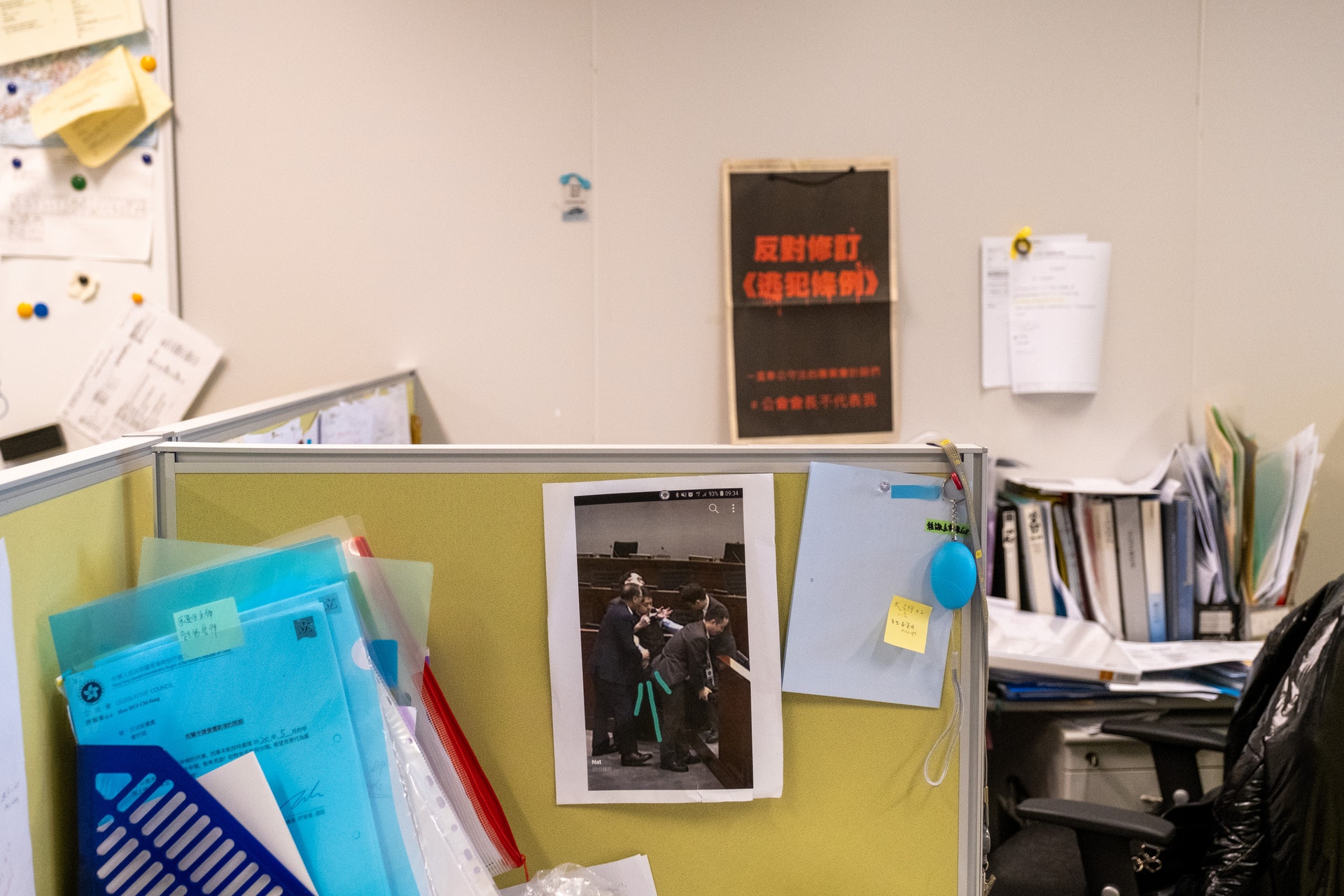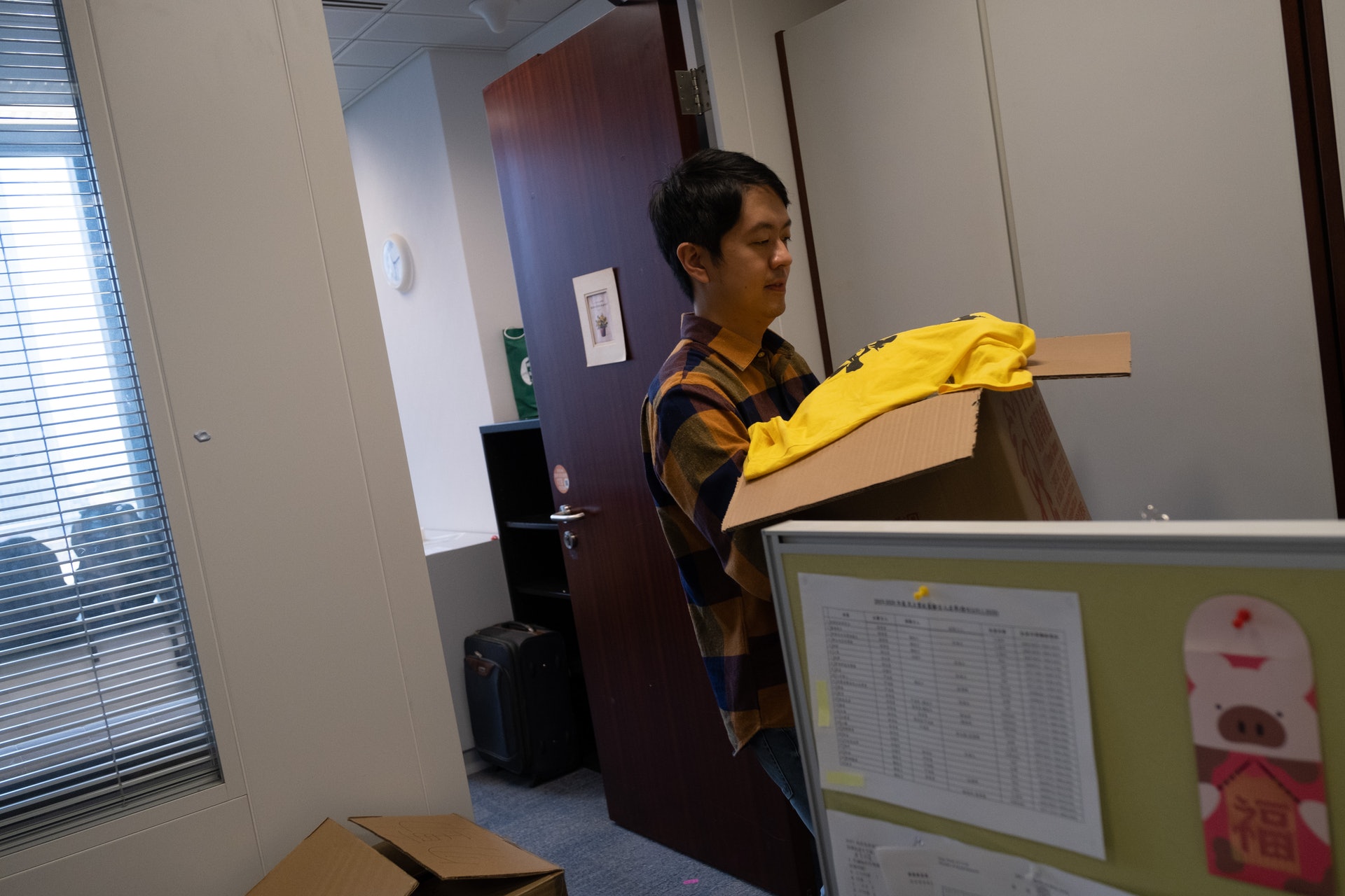 許智峯在離任立法會議員前最後一日,收拾辦公室的物品。(梁鵬威攝)