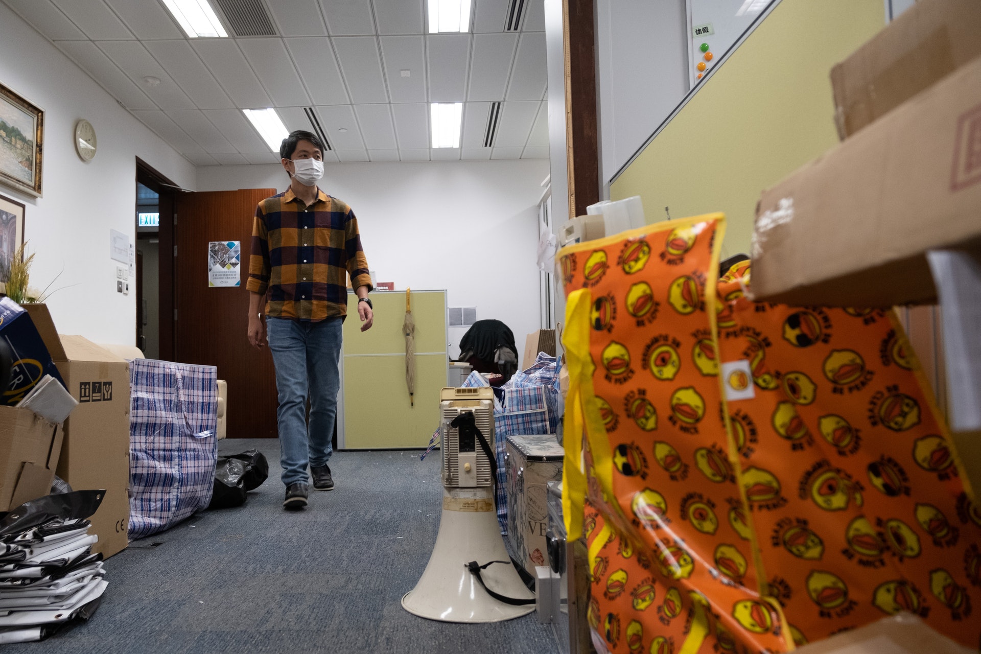 許智峯在離任立法會議員前最後一日,收拾辦公室的物品。(梁鵬威攝) |