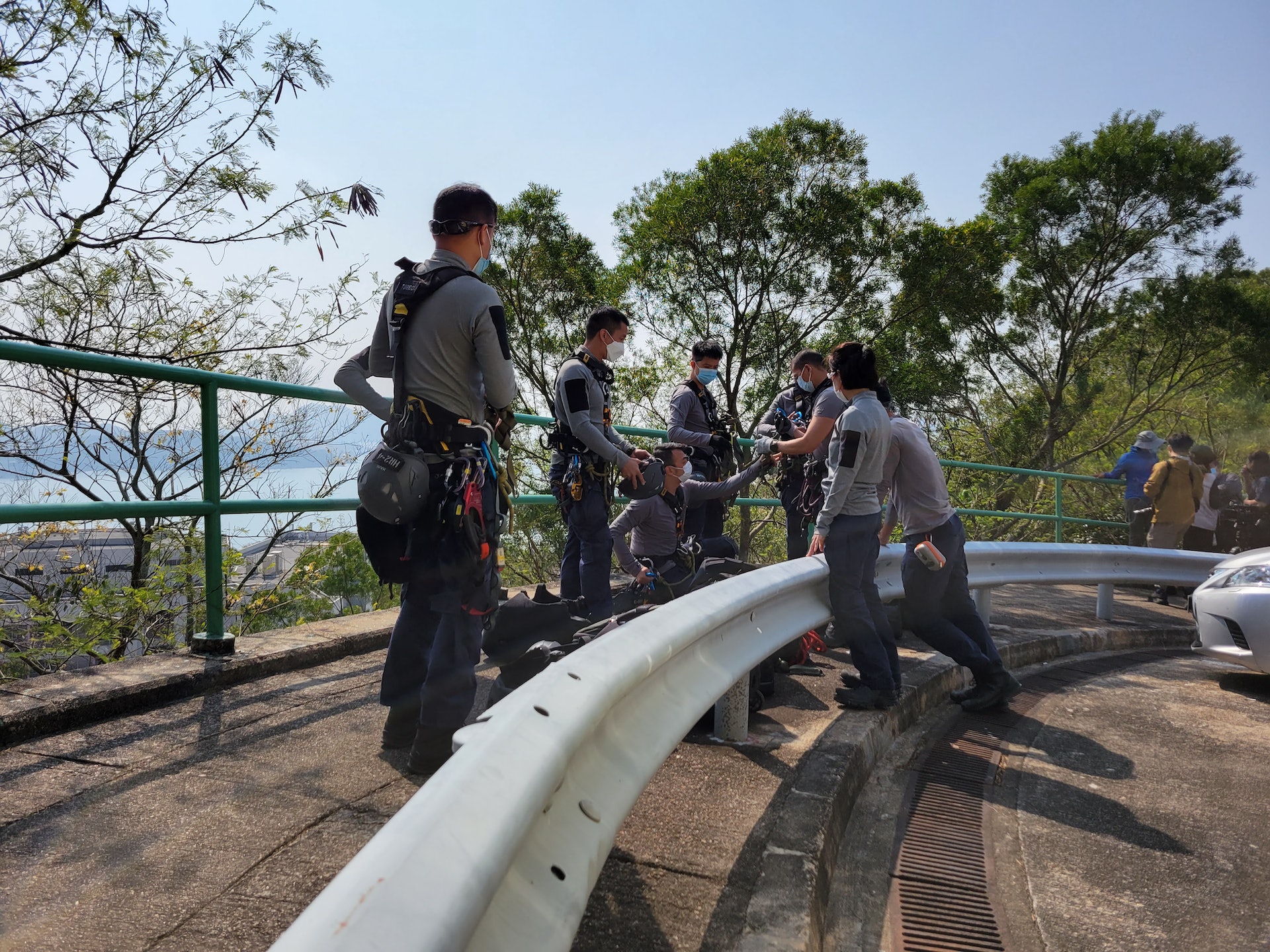 今日(26日)警方繼續懷疑棄屍處將軍澳華人永遠墳場搜尋失蹤遺骸,高空搜查隊在山坡游繩而下,搜索儲水池對上山坡。(蔡正邦攝)