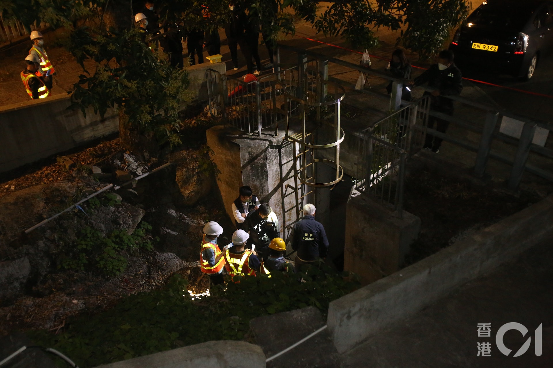 警方及渠務署人員入黑後繼續檢查村屋四周的沙井。(林振華攝)