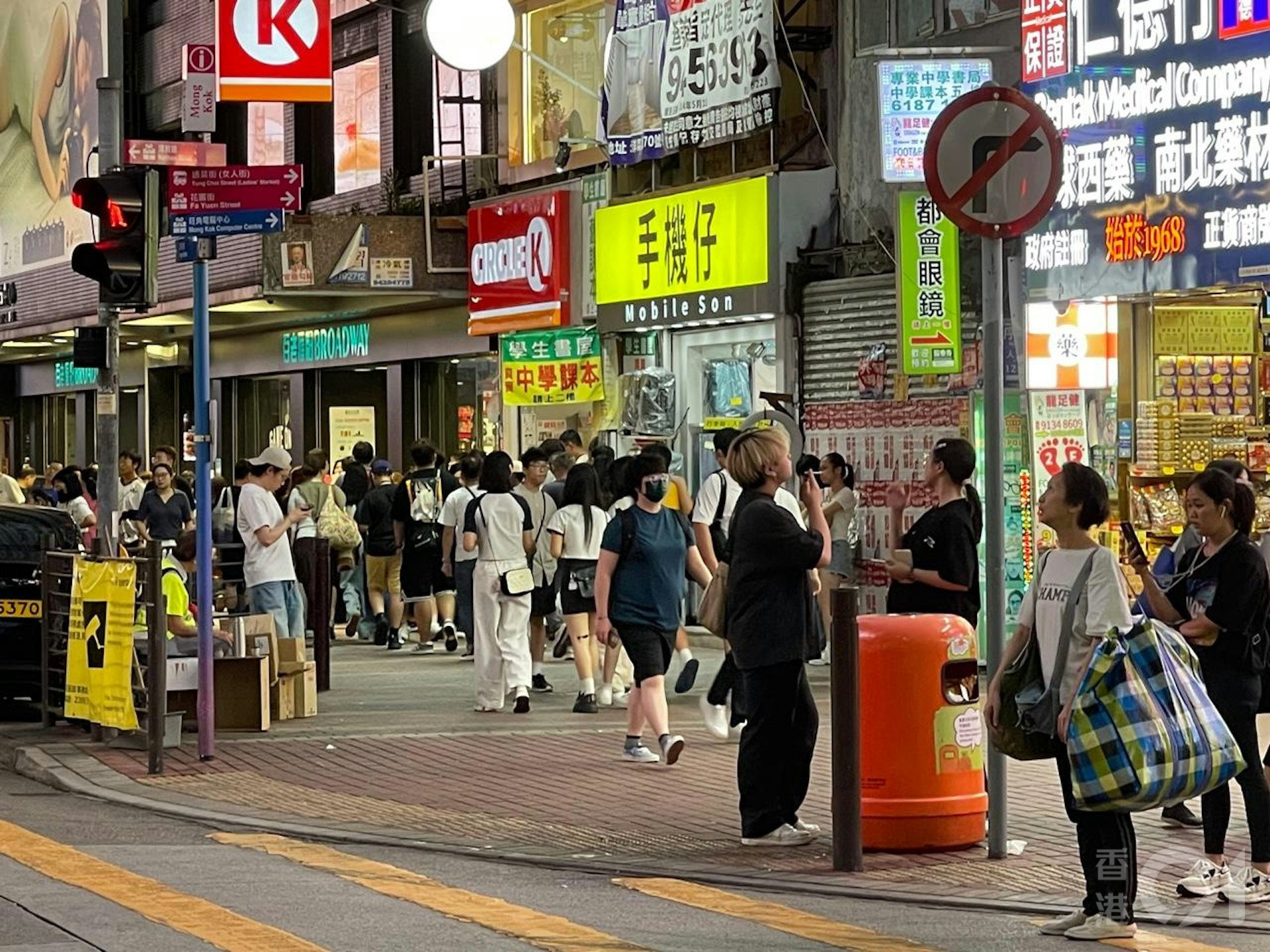 5 V- [) n& L W. I0 n! B2 B) d3 i旺角西洋菜南街尚算力保不失,路面擠迫,亦有許多表演者,吸引不少人駐足圍觀,一片熱鬧。地標商場朗豪坊未算十分擠擁,但亦不冷清,「天梯」依舊站滿人。