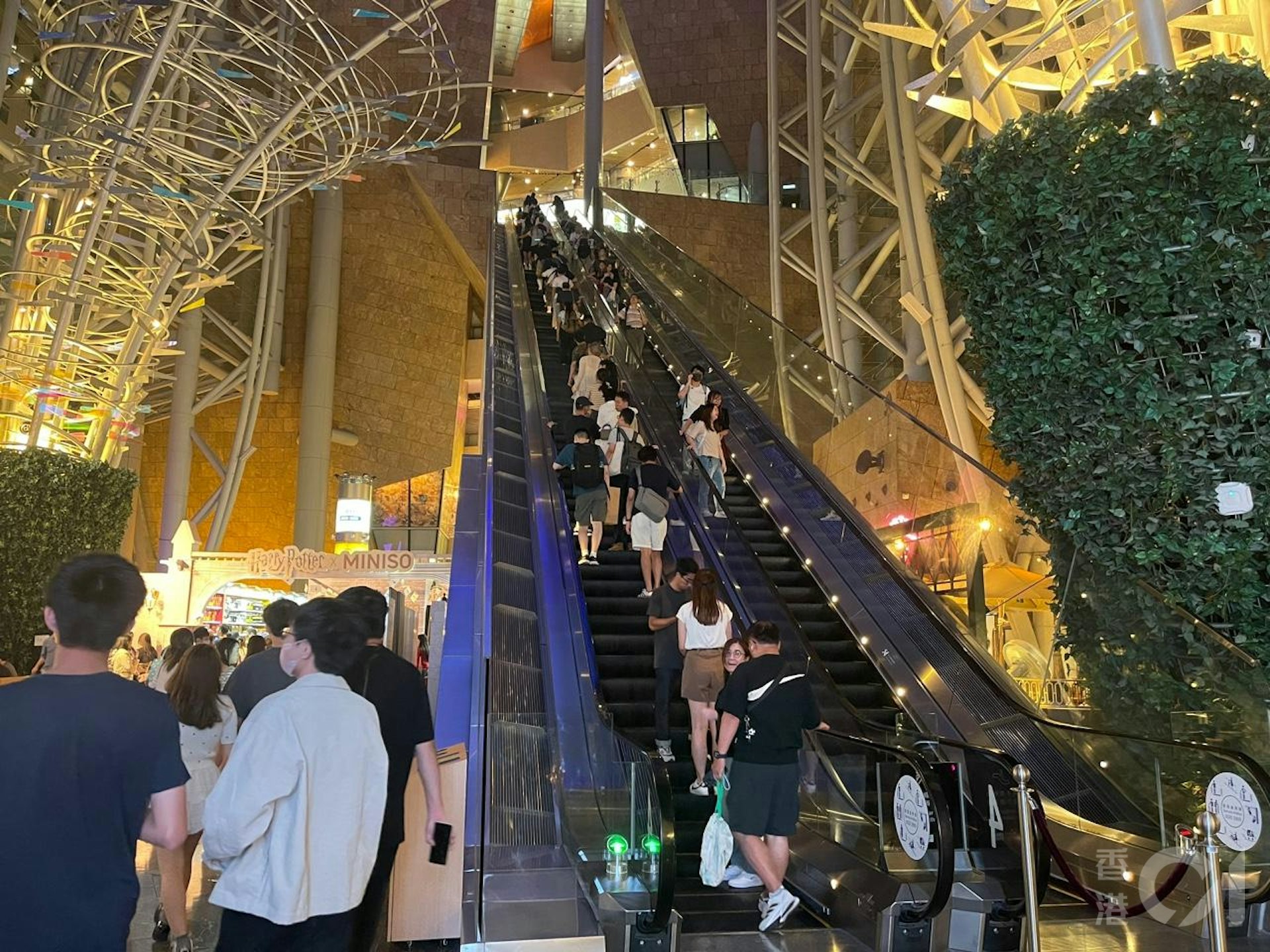 / l4 x6 e8 Z- I/ }公仔箱論壇10月11日重陽節傍晚,旺角朗豪坊「天梯」站滿顧客。(洪戩昊攝)+ e" M) F! S y. ?9 ^