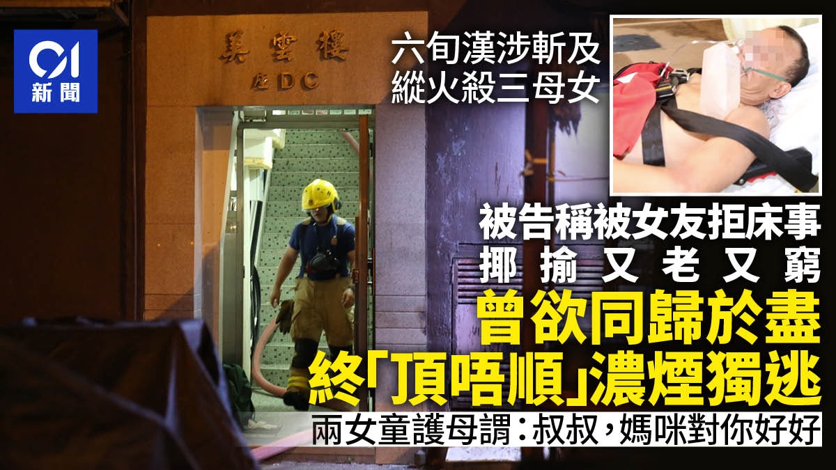 被告續指,揮刀後用火機點燃衣物,打算四人同歸於盡,惟他最終「頂唔順」濃煙,衝出單位。他離開時,溫和兩女童大叫求救。警員問及三人的屍體堆疊時,被告稱起火時,她們攬在一起,他不知道為何三人的屍體會堆疊起來。