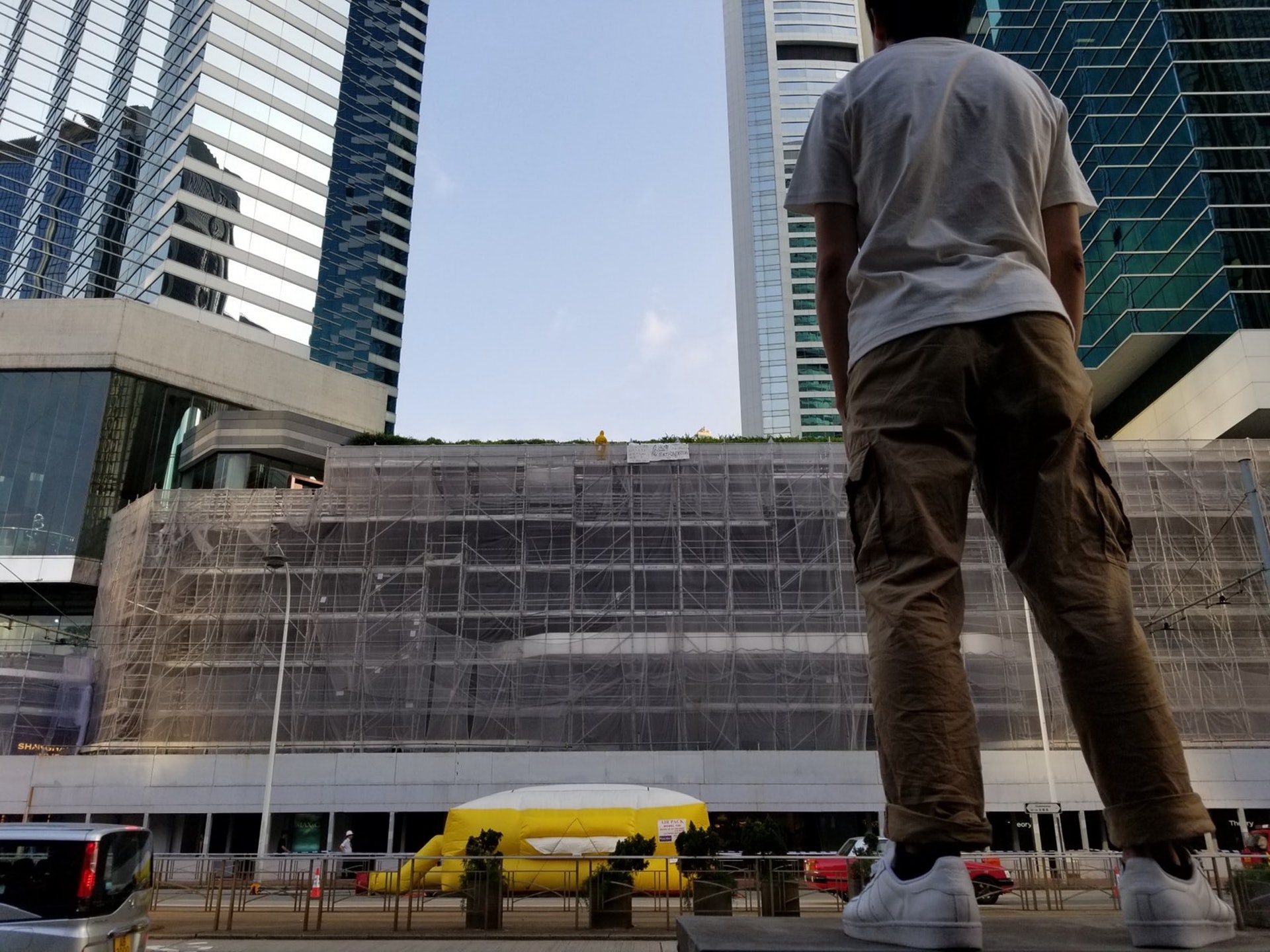 6月15日,特首林鄭月娥宣布暫緩《逃犯條例》修例工作,收回二讀預告後,有一名穿上黃色外套的男子登上太古廣場的平台,他在邊棚架上掛起「反送中No Extradition To China」的橫額,上面亦寫有「全面撤回送中,我們不是暴動,釋放學生傷者,林鄭下台,Help Hong Kong」的訴求標語。立法會議員鄺俊宇聞訊趕至了解並嘗試與其對話。然而到9時左右,男子突然爬出棚架,墮下不治。民眾翌日發起了追思活動,手拿白花紀念他。(王譯揚攝)! I7 ?0 Y, [/ l