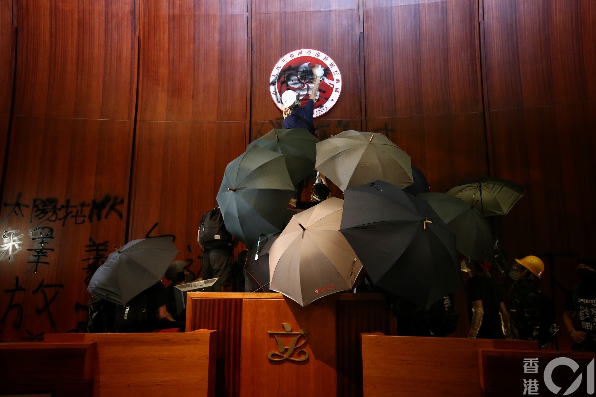 0 C# ^5 o0 V! l9 ^在七一回歸紀念日,反《逃犯條例》修訂示威再升級,民陣再次發起遊行。示威者凌晨便在金鐘一帶聚集,早上與警方在會展一帶爆發衝突。下午情勢急轉直下,有示威者衝擊立法會,晚上近9時終於攻破並佔領會議廳。示威者在立法會內塗黑區旗、塗鴉牆壁、並破壞立法會內設備。(羅君豪攝)