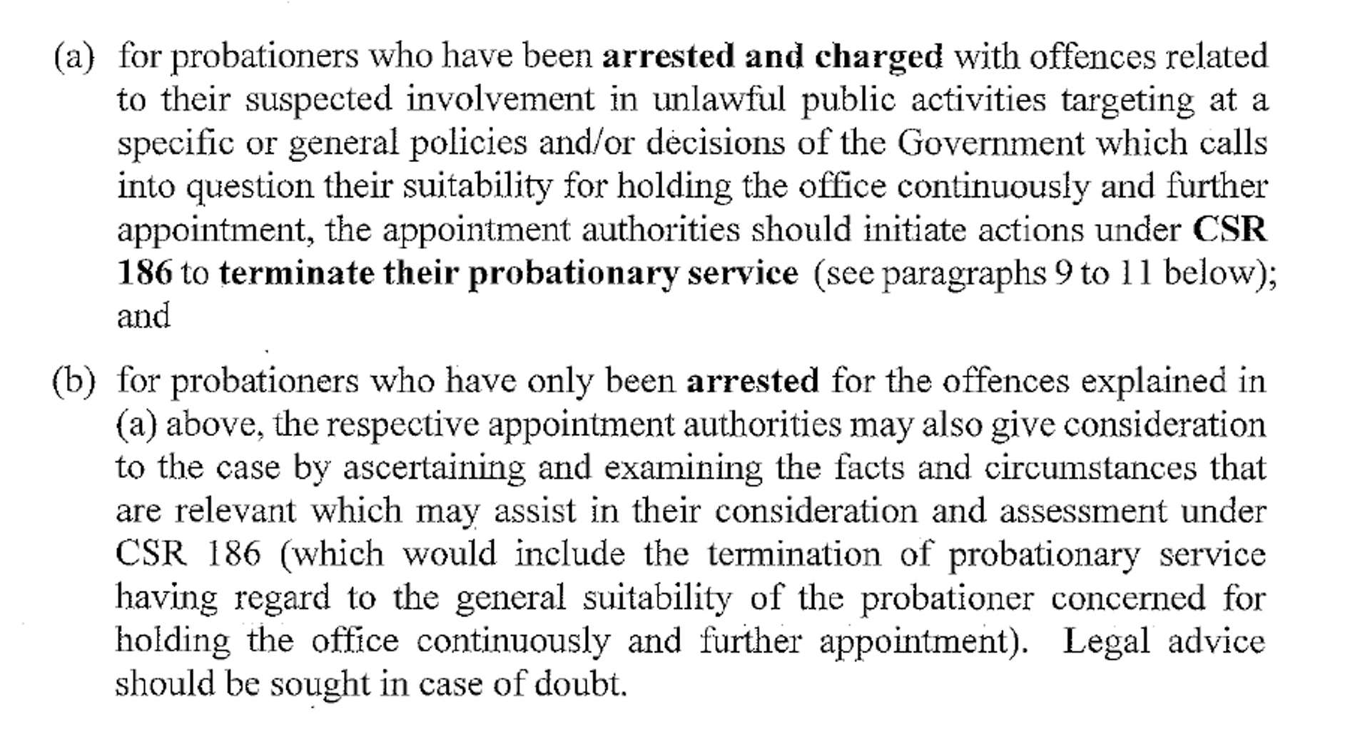 公務員事務局發給各部門主管的文件,就試用期公務員參與非法公眾活動一旦被捕及起訴,有兩種處分要求。(文件截圖)