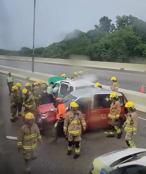 港深西部公路發生嚴重車禍,涉及兩架的士和一架中港牌四驅車。(梁偉權攝)tvb now,tvbnow,bttvb/ X' S% l) u. T" o# y+ D, I& o