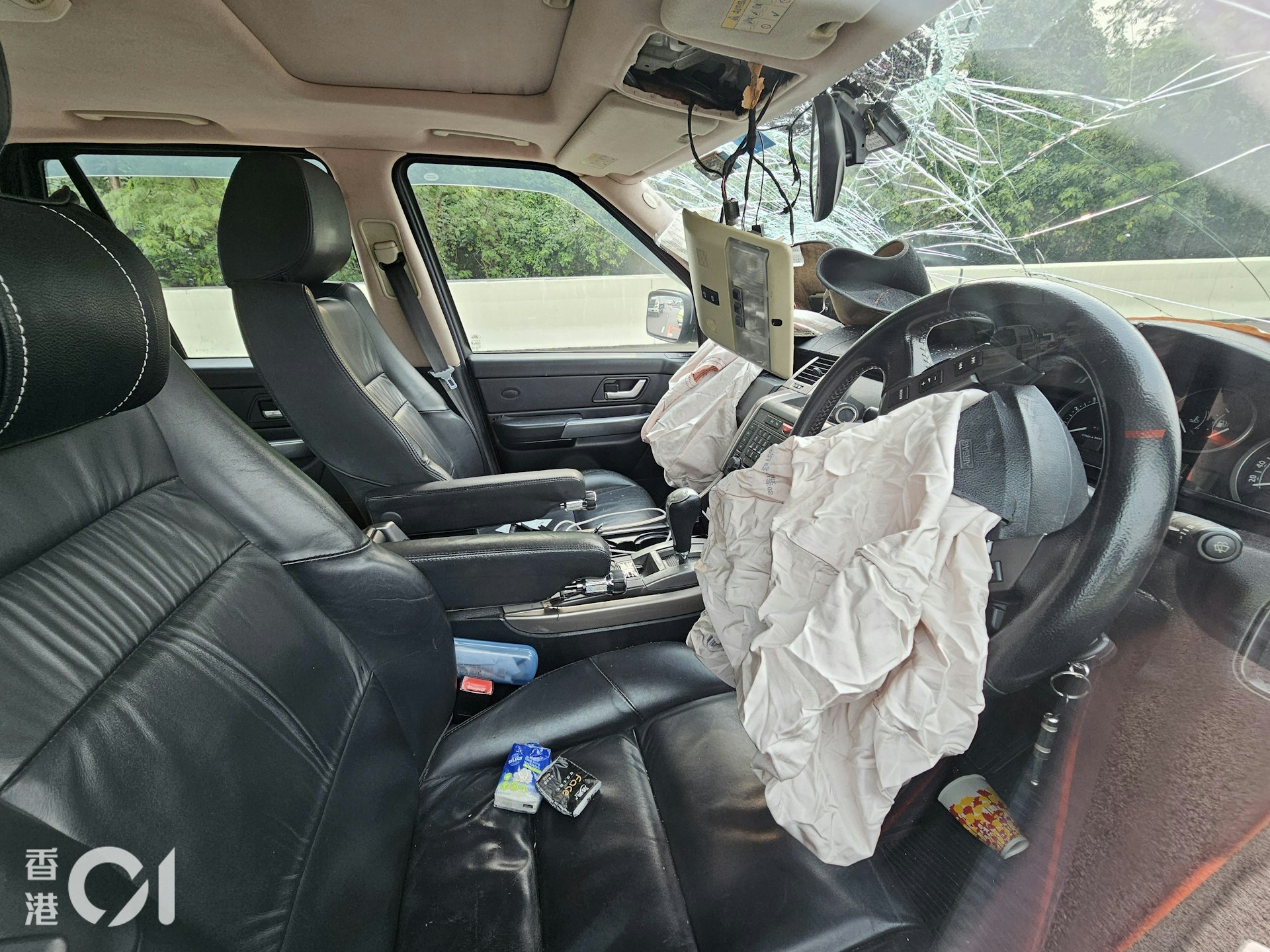 R+ t. H; e( {1 k另一架涉事的Range Rover中港牌四驅車,意外後停在兩架涉事的士前方約20米的中線,其車頭撞毀凹陷,擋風玻璃亦破裂成蜘蛛網狀,司機及副駕駛座安全氣袋彈出。, w; @4 I% M% F: X7 S. r3 R3 f/ e