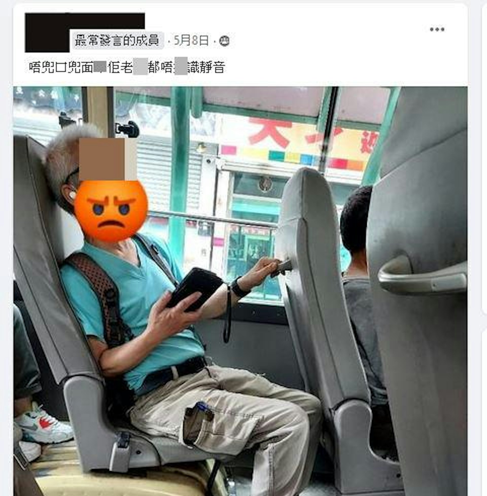 ; u1 T |1 m0 B: A! Z! B乘搭公共車輛要有公德心。該港男於Facebook群組「To Kwa Wan 土瓜灣之友」發相發文講述經歷,指他乘搭小巴時,坐旁邊的老伯用手機大聲播片,他不勝其煩於是出絕招令老伯關閉手機聲音,「唔兜口兜面X佢老X都唔X識靜音」。