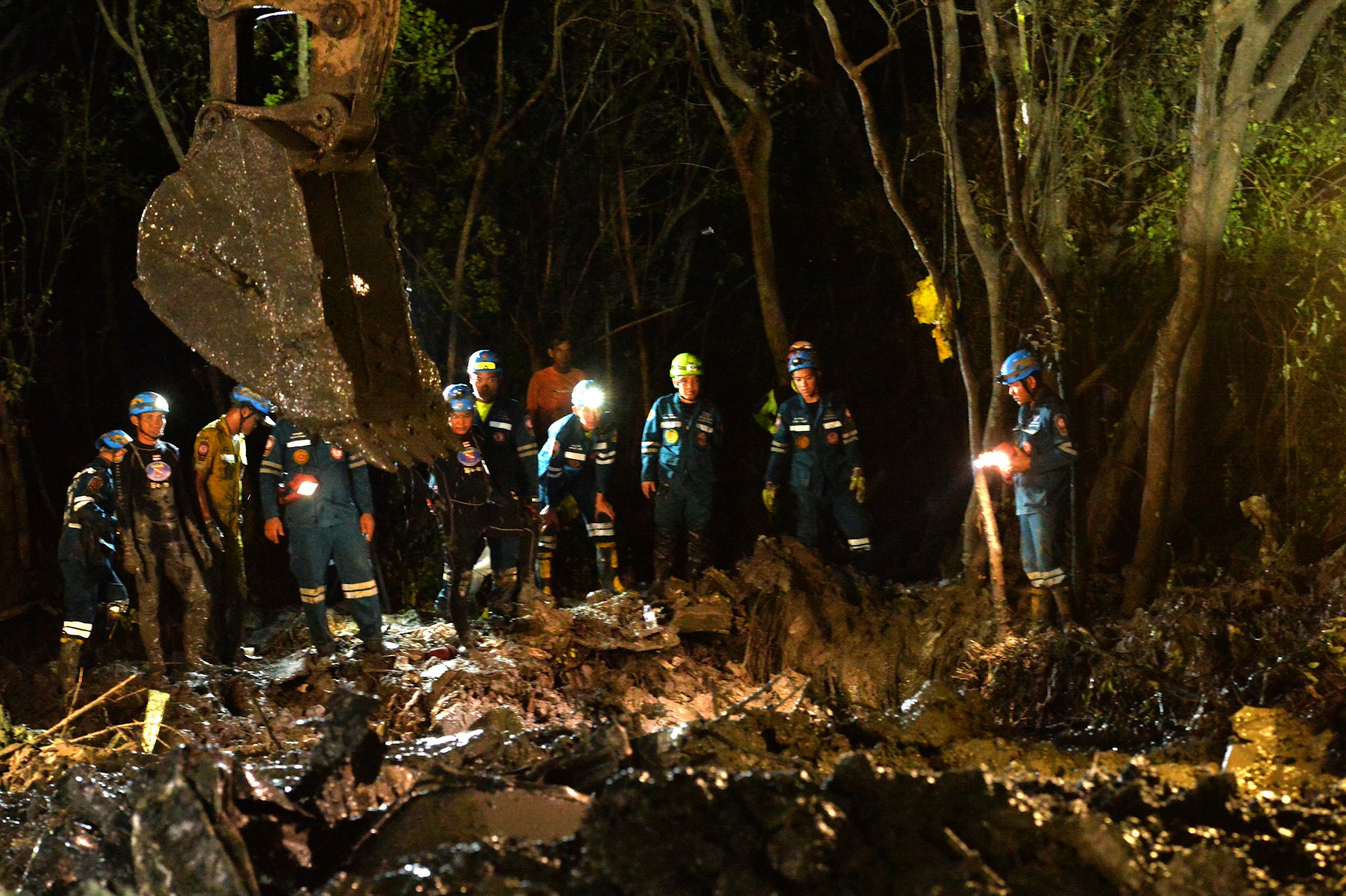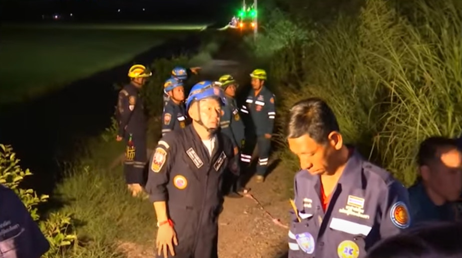 泰國北柳府2024年8月22日一架小型飛機失事,多人死亡,圖為搜救隊展開工作(影片截圖)
