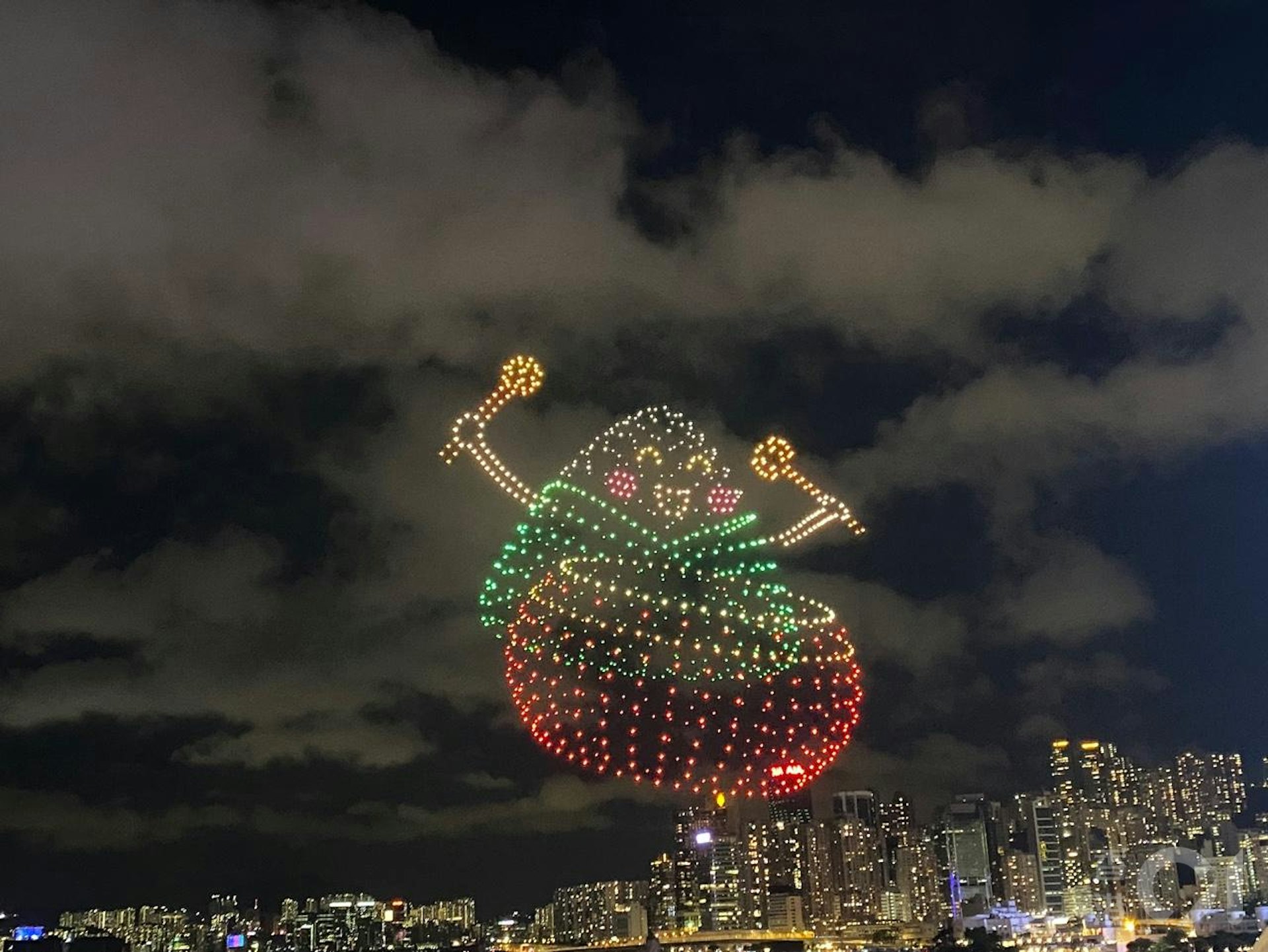 旅發局今晚(10日)8時於灣仔海濱對出海面舉行端午節慶主題無人機表演。無人機先出糉子公仔打鼓圖案。(蘇煒然攝)