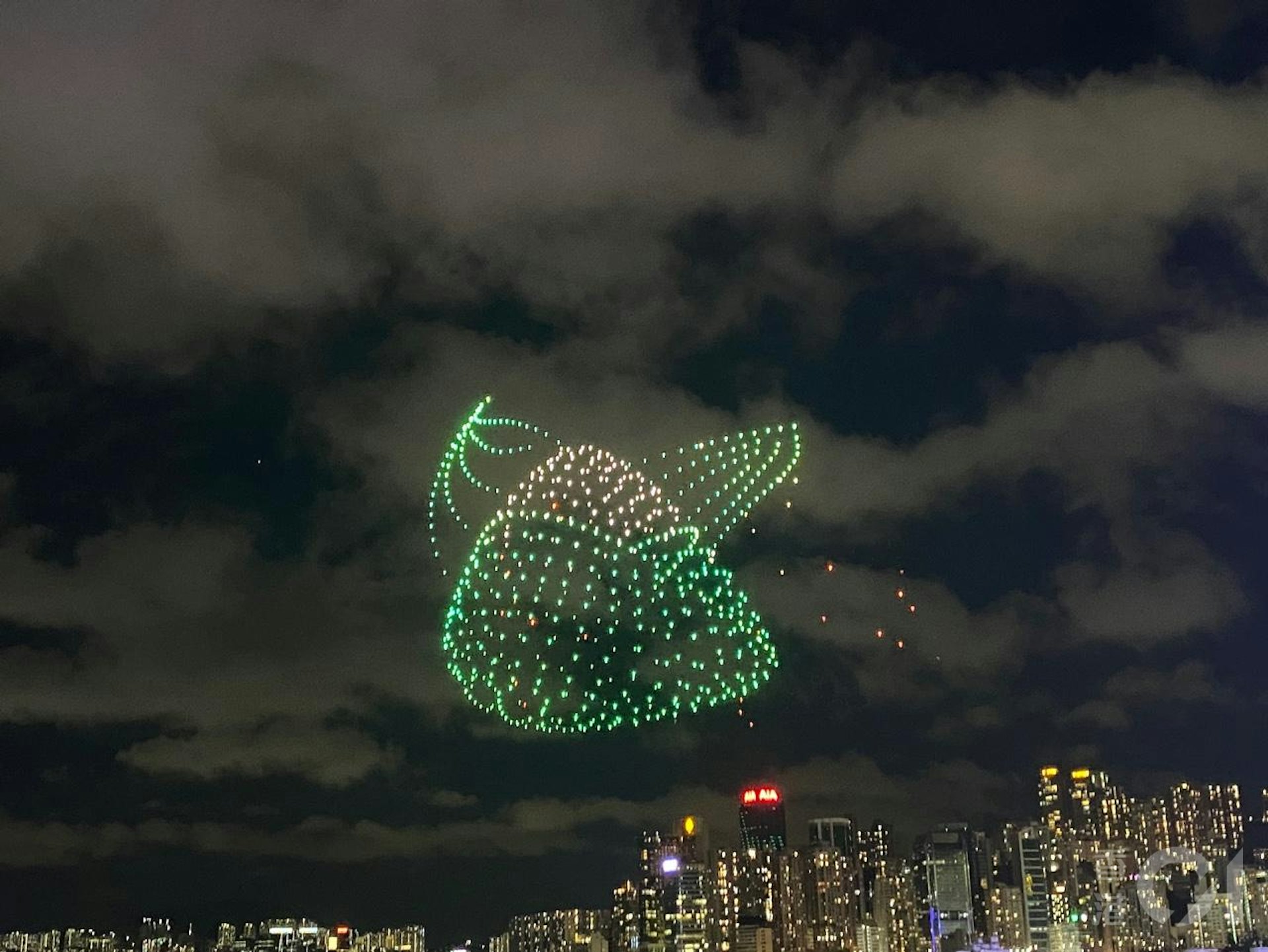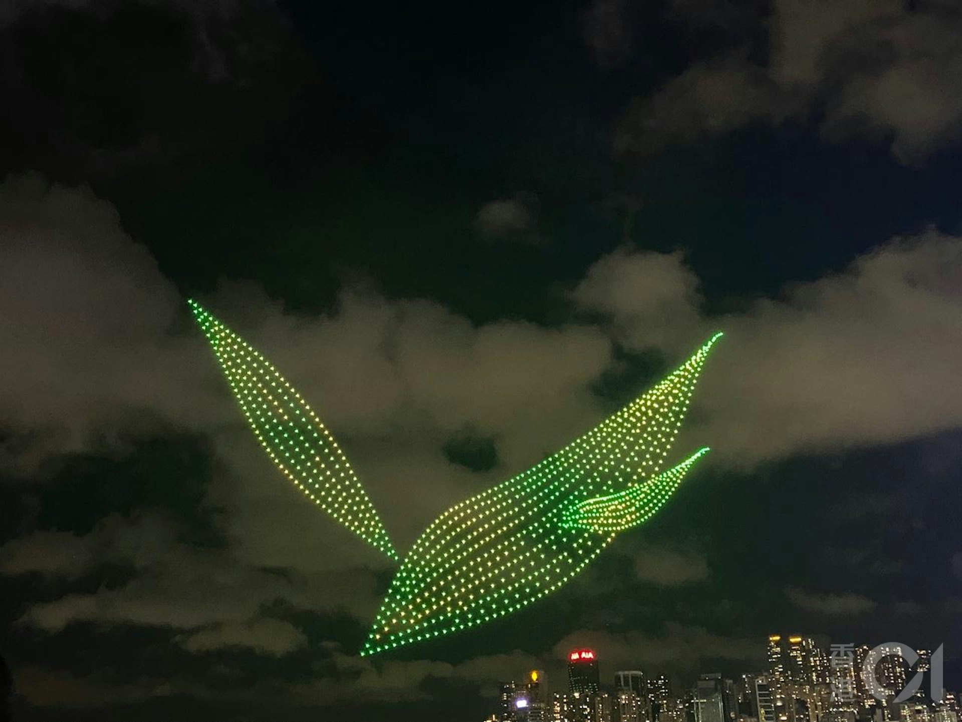 旅發局今晚(10日)8時於灣仔海濱對出海面舉行端午節慶主題無人機表演。無人機切出的鯨魚圖案散開變回三片竹葉。(蘇煒然攝)tvb now,tvbnow,bttvb8 }1 Q% Q0 S4 P1 R3 z/ h