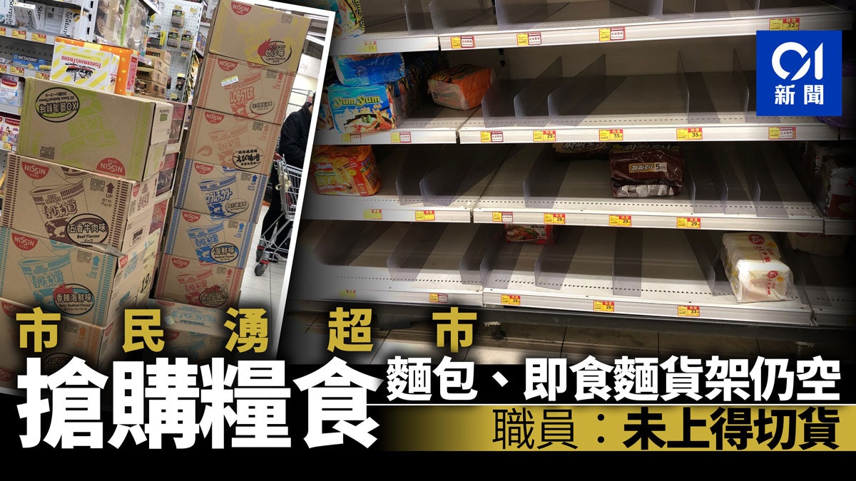 武漢肺炎肆虐,除了口罩等防疫用品被搶購一空外,連日用品都出現搶購潮。不少市民到超市搶購糧食及日用品,超市貨即食麵及放置麵包貨架空空如也。今早超市大部份貨架仍空置,大批貨品擺放地上,有職員表示,昨晚起已馬不停蹄為即食麵補貨,「完全冇停過!」