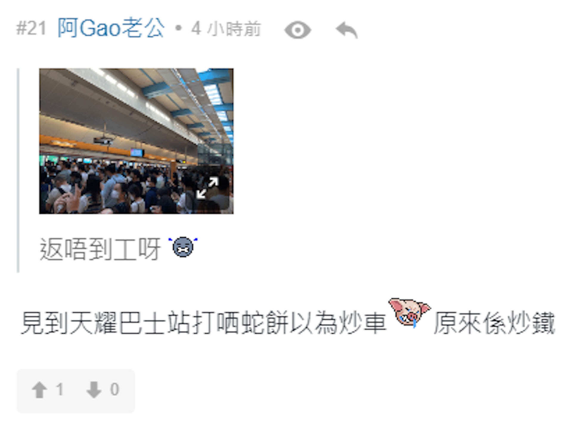 ( b$ T+ G1 }/ V公仔箱論壇港鐵不時出現信號或人為故障,令一班打工仔叫苦連天:「死沙田圍站都搞到屯馬全線崩潰」、「見到天水圍天耀巴士站打晒蛇餅以為炒車,原來係炒鐵」、「宣布話恢復正常,但其實