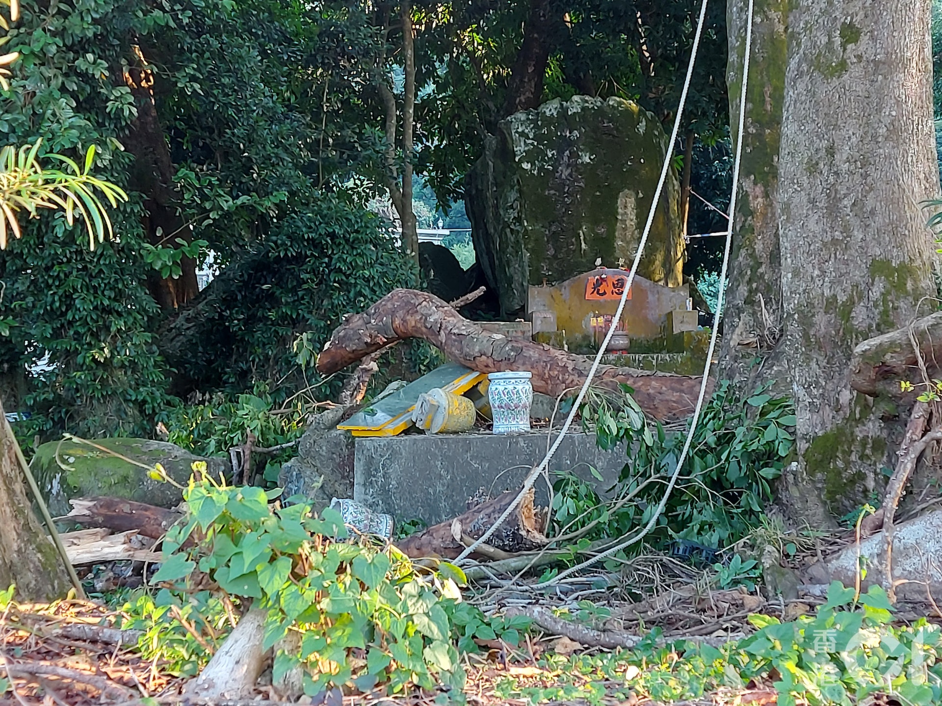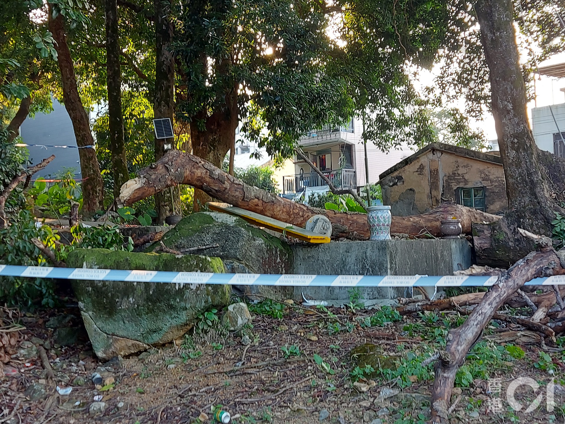 現場所見,樹幹塌下並壓中一個墳頭。(王譯揚攝)