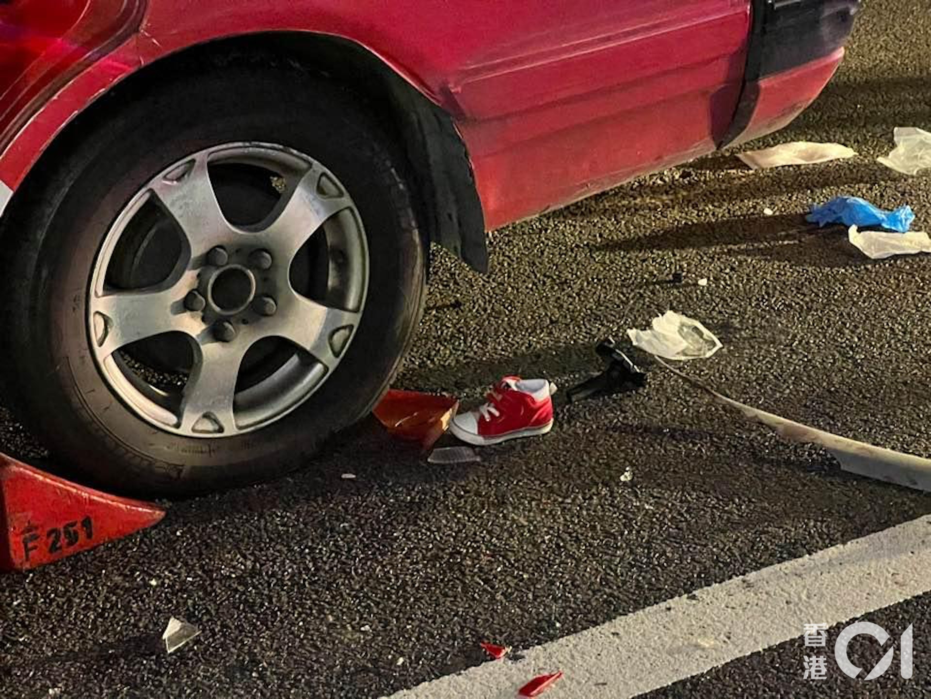 的士剷入吊臂車車底,後方遺下一隻幼童的鞋。(魯嘉裕攝)/ Z) y A" X: A) t5 B