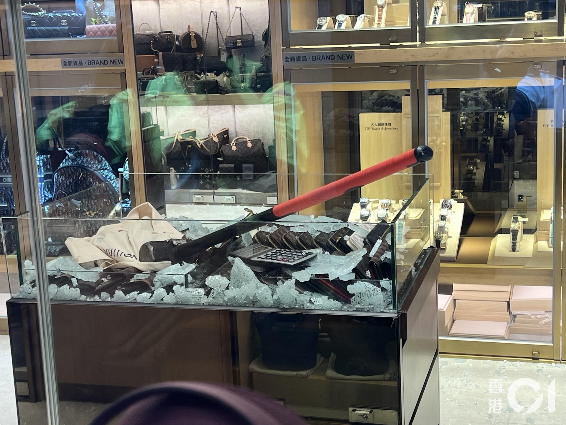 尖沙咀廣東道「名人站」遭多名匪徒持刀槌行劫,事後一個大鐵槌被棄於店內一個飾櫃,飾櫃玻璃已被打碎。(朱永倫攝)公仔箱論壇& b) C8 ?* i6 ?% P0 B