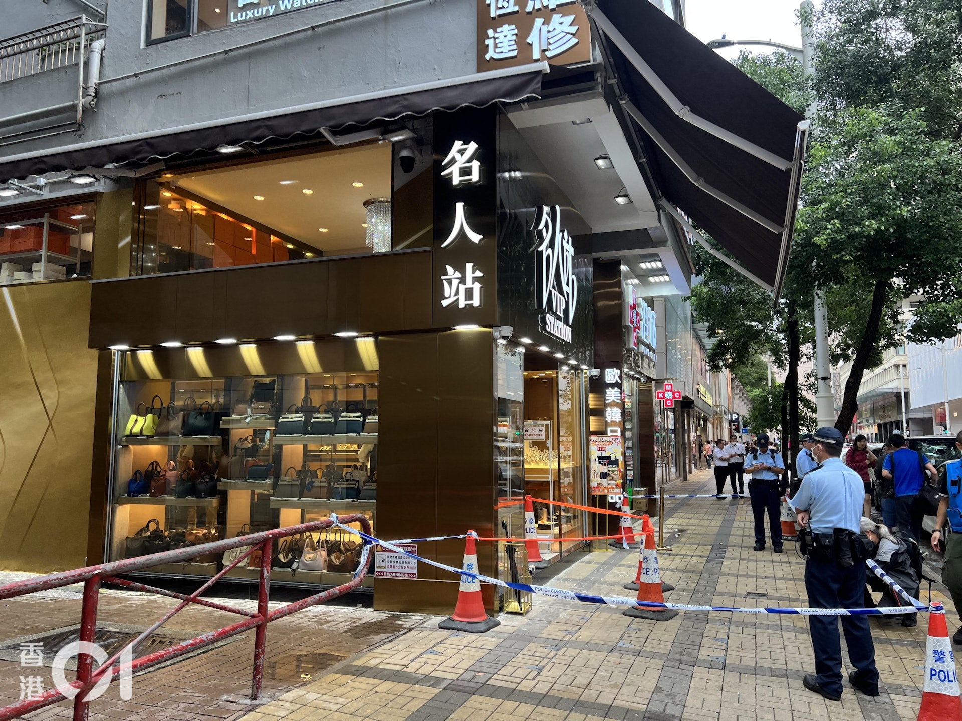 尖沙咀廣東道「名人站」遭多名匪徒持刀槌行劫,有探員進入店內調查。(朱永倫攝)