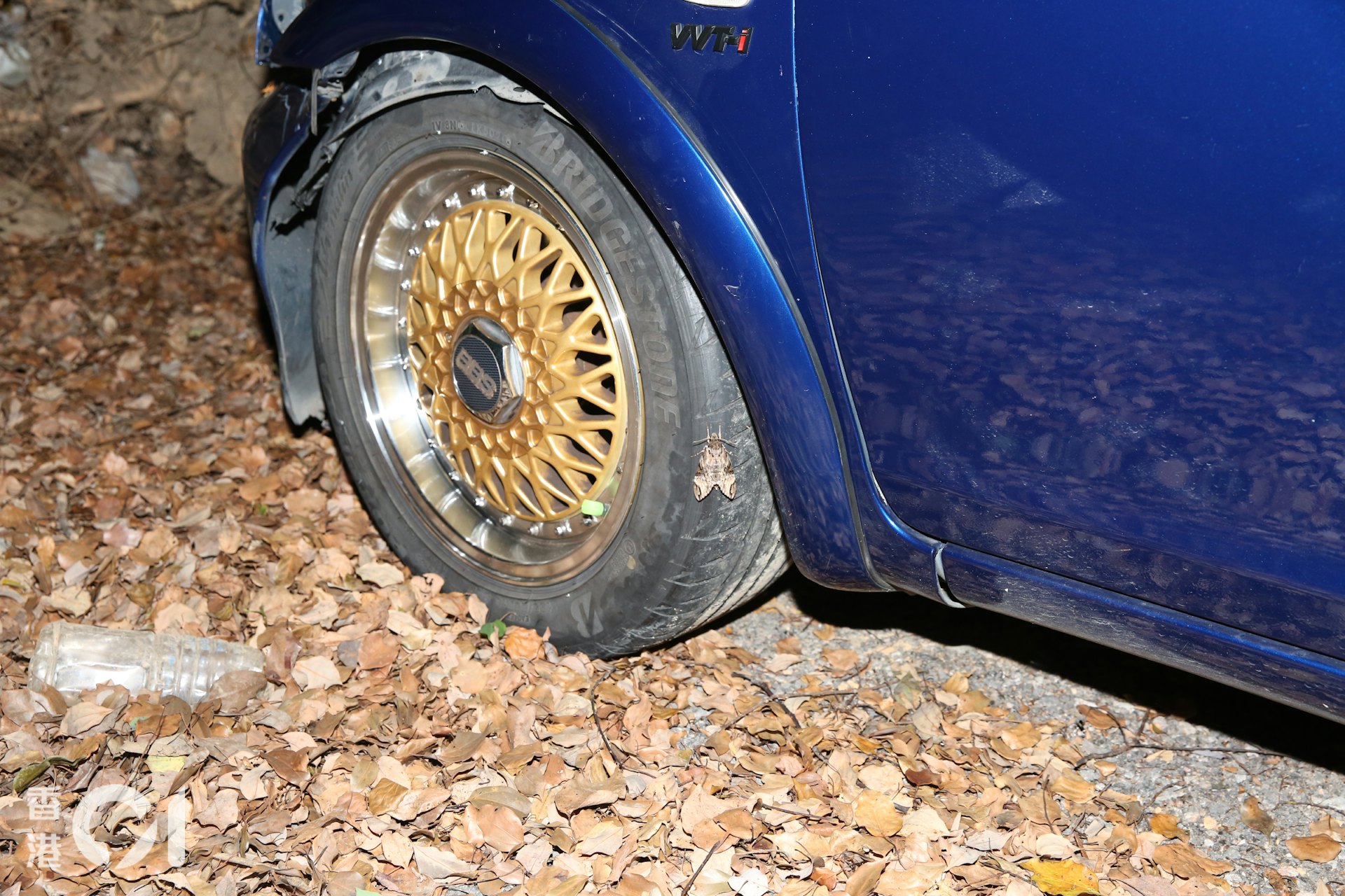 69歲老婦4月4日晚在上水松柏塱踩單車時,懷疑被私家車撞到,警方4月5日在上水虎地拗道尋獲一輛懷疑與案有關私豐田私家車,一隻飛蛾停在該車左前轆上。(王譯揚攝)tvb now,tvbnow,bttvb) z$ g; l% k; t3 P, |4 H. ]2 ]