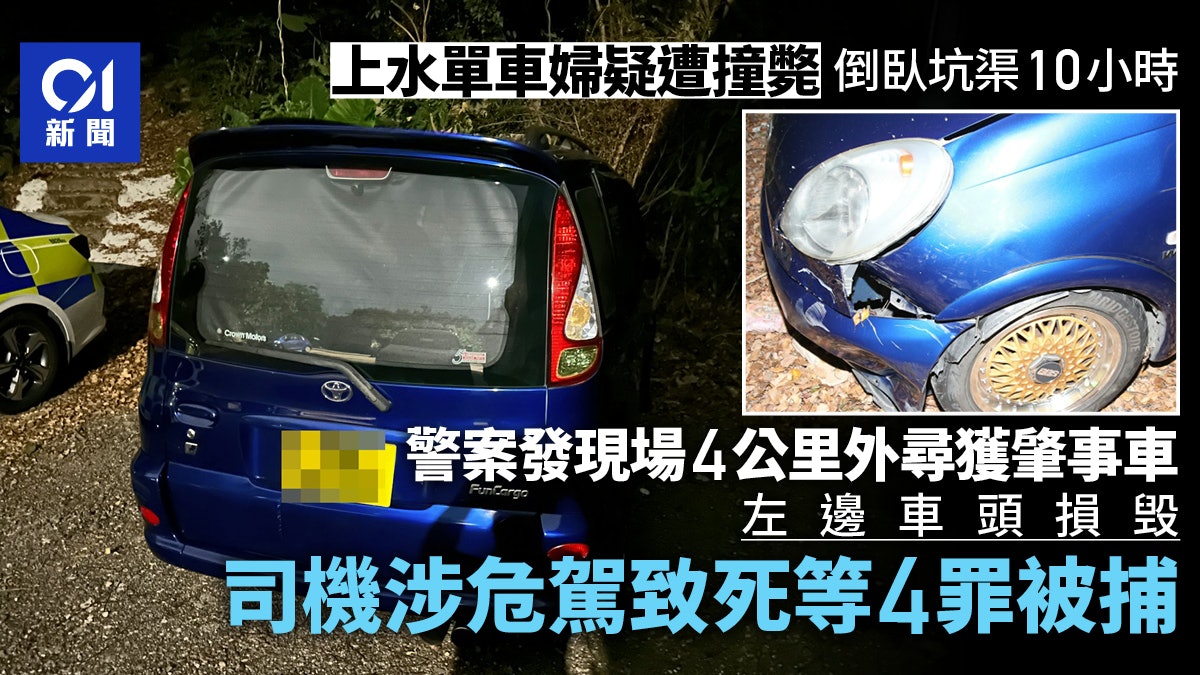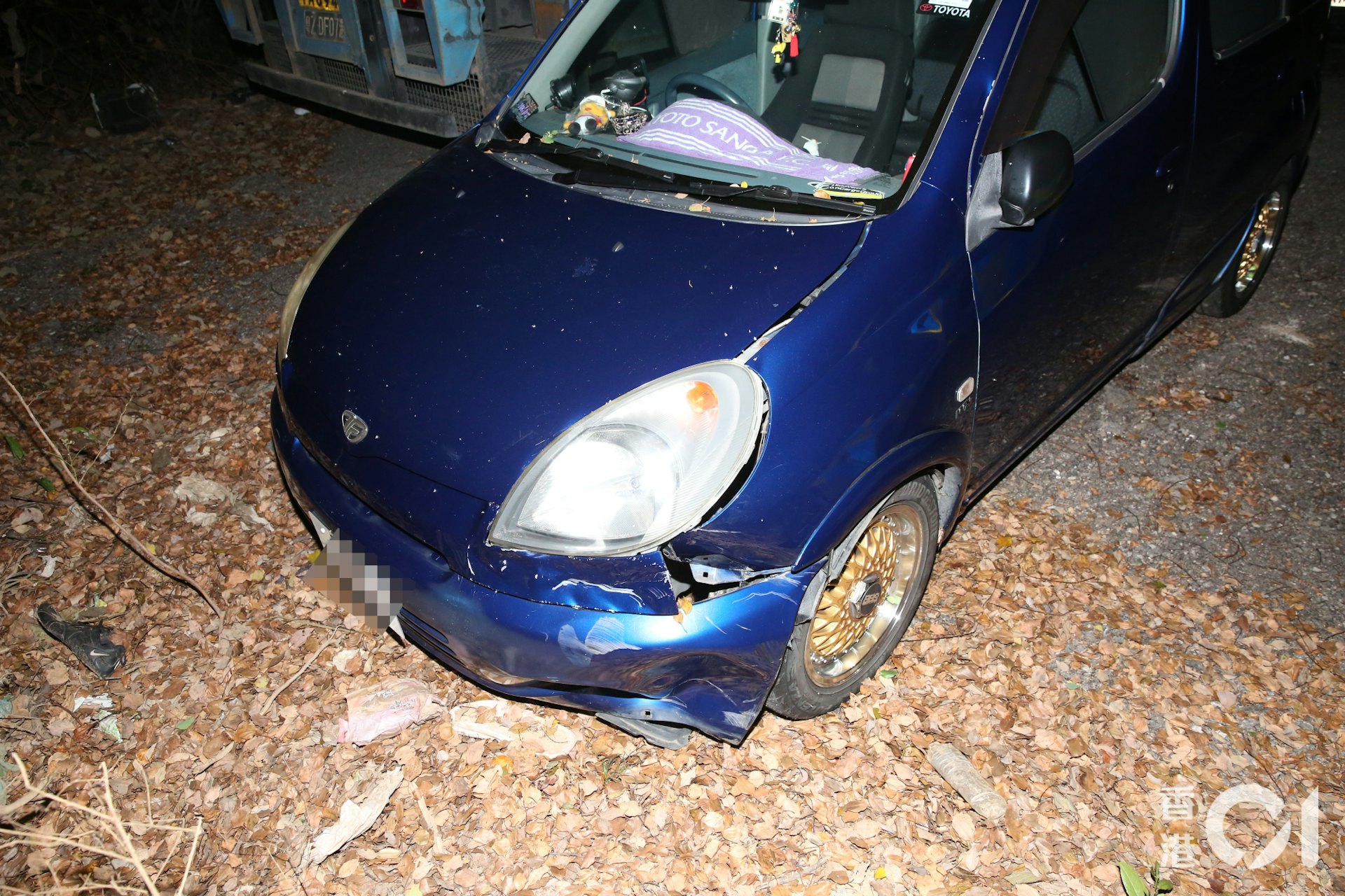 上水松柏塱發生奪命車禍,69歲老婦疑昨晚踩單車時被私家車撞倒昏迷,疑倒臥坑渠內約10小時,至今早(5日)始被剪草工人發現,惜告不治,肇事私家車事發後不顧而去。消息指,警方翻查閉路電視鎖定可疑的深色私家車,至傍晚時分,人員於上水虎地拗道尋獲一輛深藍色豐田私家車,車身左邊車頭嚴重損毀,懷疑與案件有關。現場所見,一隻飛蛾停留在私家車左前轆上。警方指,涉案私家車車頭燈懷疑曾被更換。根據地圖,私家車被發現的位置,距離案發現場約3.7公里。警方表示,今晚已在粉嶺祥華邨拘捕一名39歲姓陳男司機,涉嫌「危險駕駛導致他人死亡」、「意外後沒有停車」、「意外後沒有報案」及「更改嚴重意外的證據」,正被扣查。據了解,被捕男子任職汽車維修員。- ]# v) H- [( i1 g# c: i$ ^