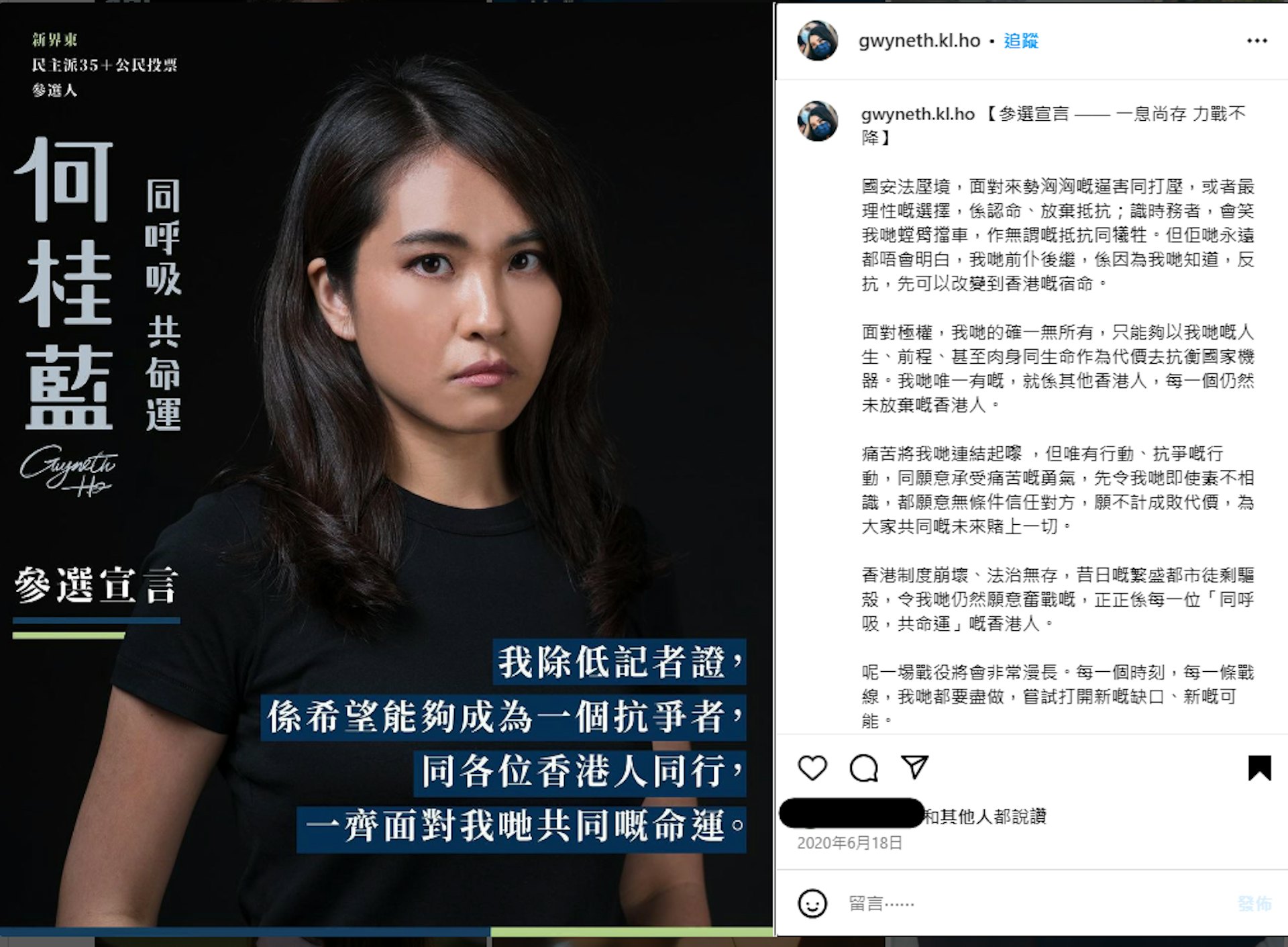2020年6月,何桂藍宣佈參加民主派新界東立法會初選。(何桂藍Instagram截圖)tvb now,tvbnow,bttvb e4 r% M* s8 M5 y+ ]$ Y- {