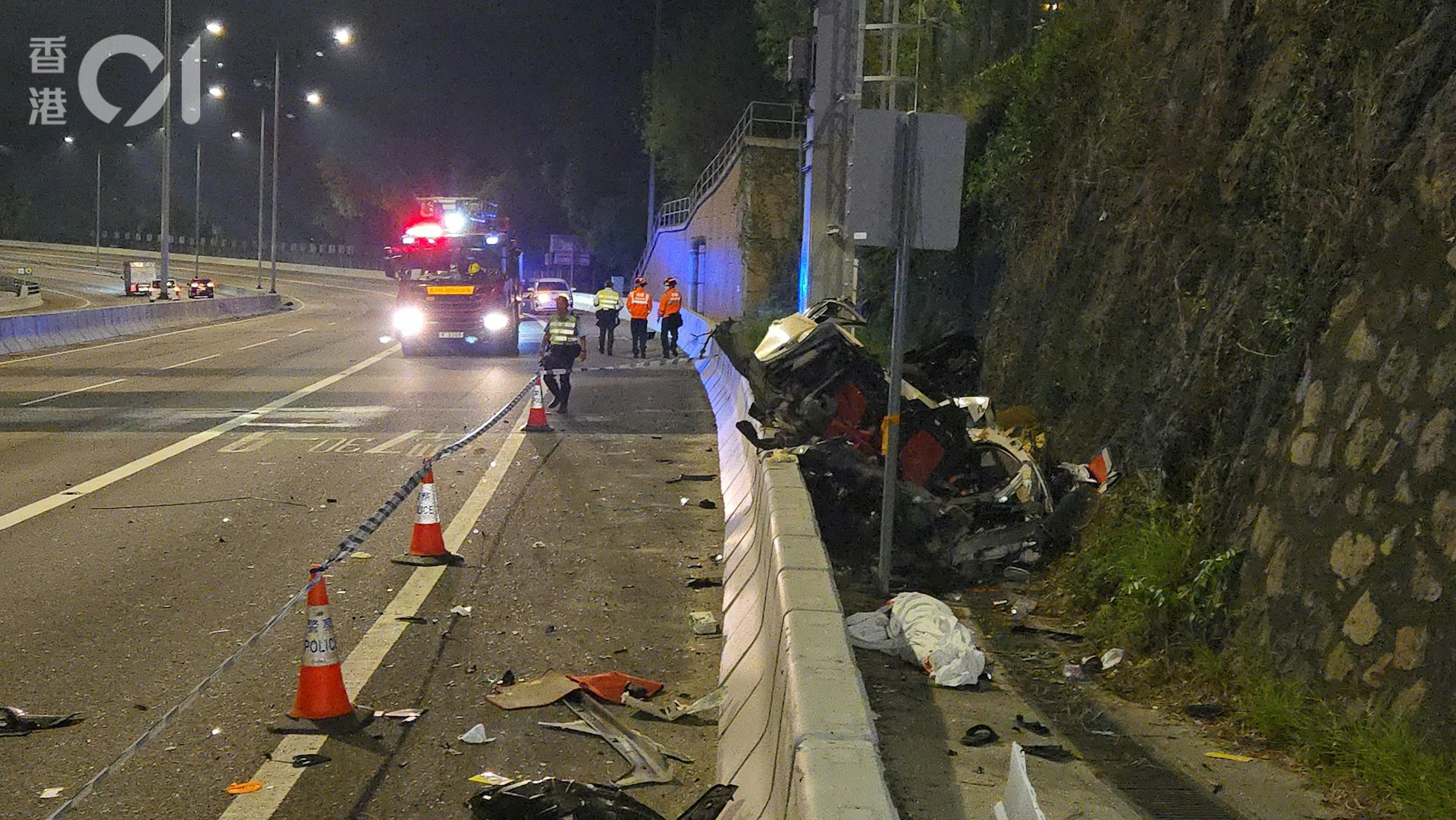 私家車撞向龍門架後斷成兩截。(陳永武攝)tvb now,tvbnow,bttvb8 a; J- m. S$ V+ ?5 x