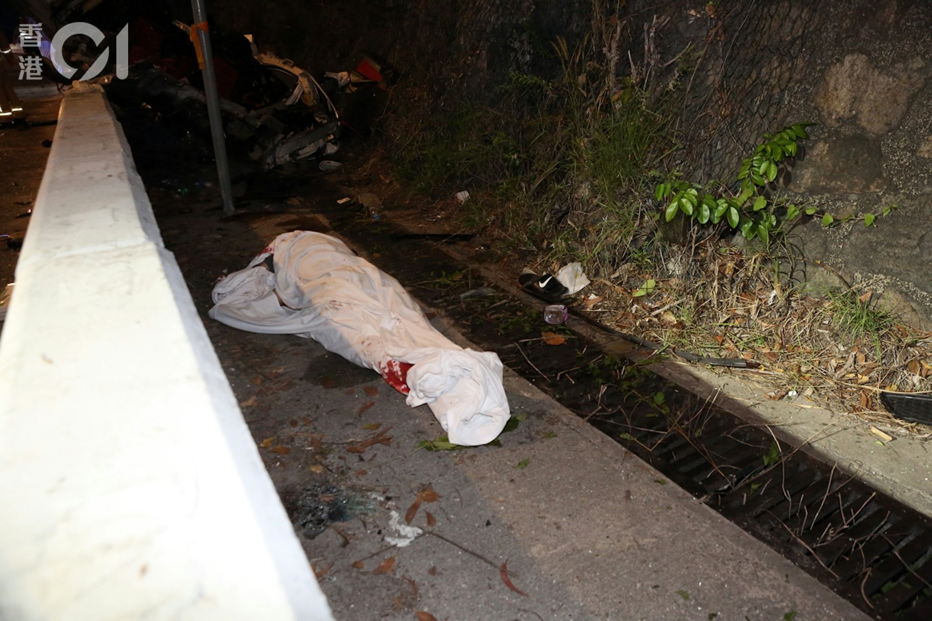 1 s5 V7 P- q. s3 Y2 d& ^tvb now,tvbnow,bttvb涉事私家車懷疑先撞龍門架,再飛出路壆外,全車盡毀。救護人員用白布遮蔽死者遺體。(陳永武攝)