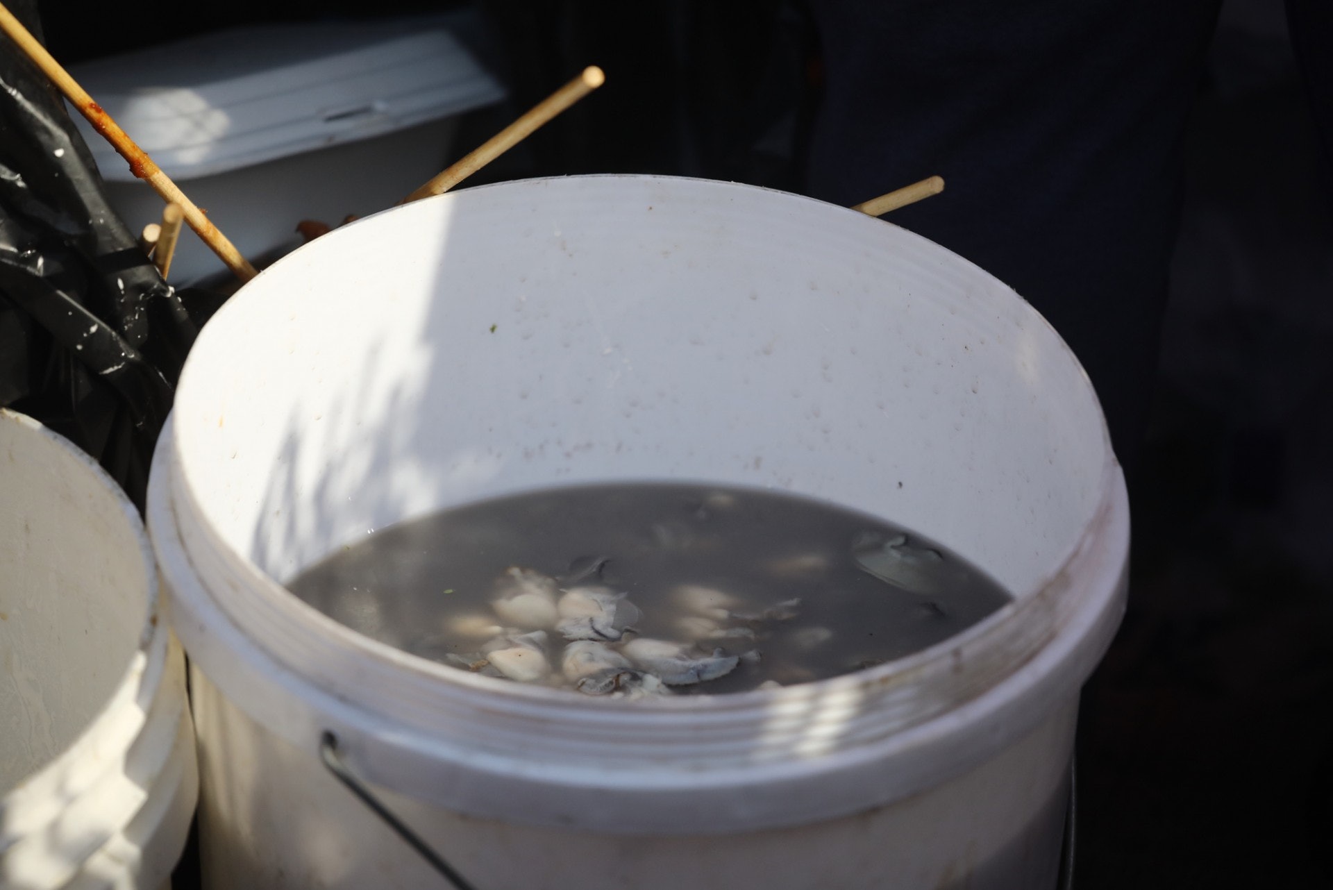 蠔殼放在灰色的水中。(盧翊銘攝)os.tvboxnow.com8 `* }. a8 F5 K# }: K