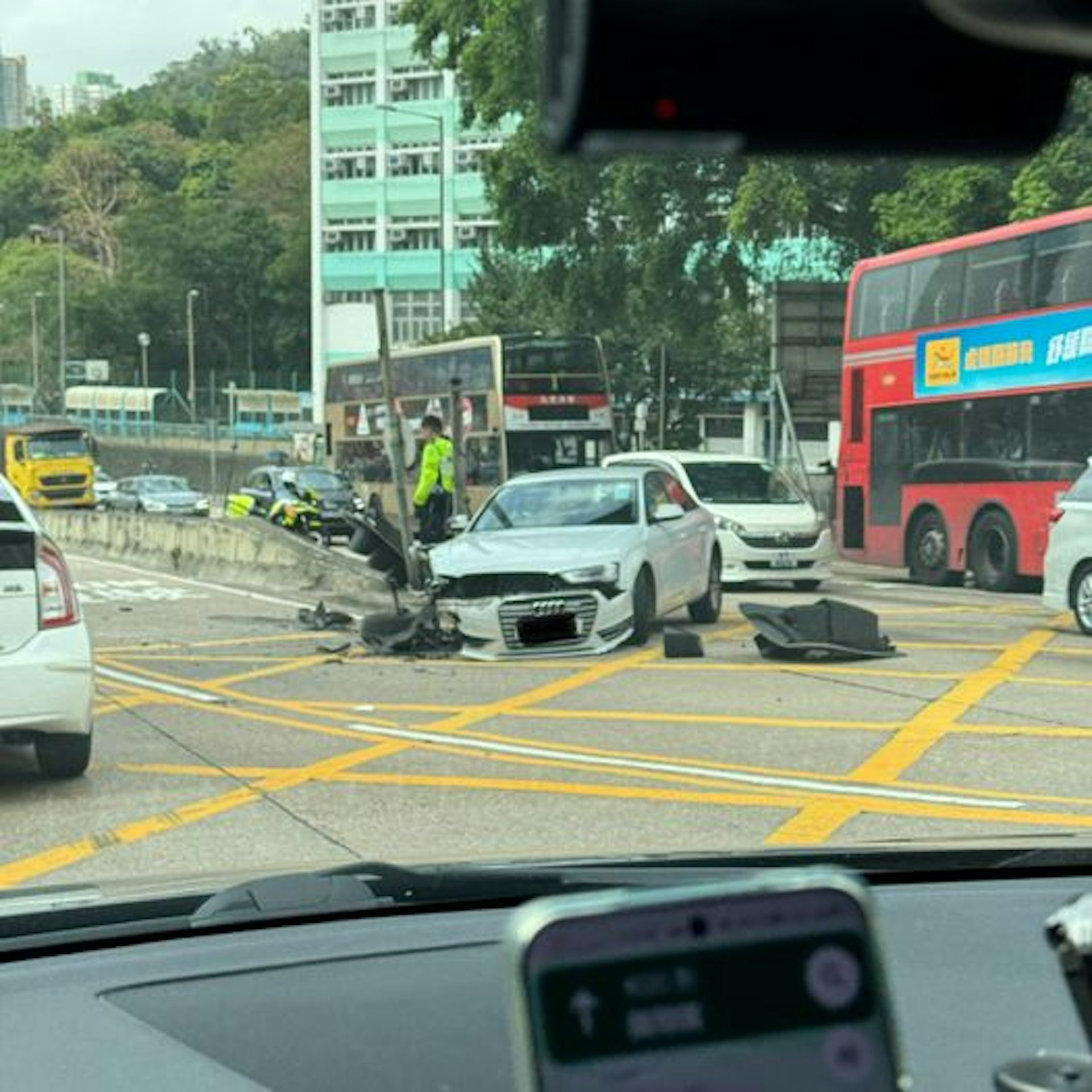 牛池灣清水灣道今午(23日)發生車禍,一輛Audi私家車懷疑失控「自炒」,撞毀兩支交通燈及一個交通標誌牌,有人事後棄車逃去。車禍現場片段曝光,據讀者提供予《香港01》的片段可見,事發後私家車車門被打開,一男一女站在車旁,男子身穿白色T恤及深色長褲、左手拿着一個手提袋,先行徒步往彩雲邨方向施施然離去;女子則彎腰疑似在車內執拾東西,之後亦將一個袋孭到肩上並關車門。片段亦可見,肇事私家車右邊車頭嚴重損毀,泵把甩脫;被撞的交通燈柱彎曲變形,燈號跌落地面。