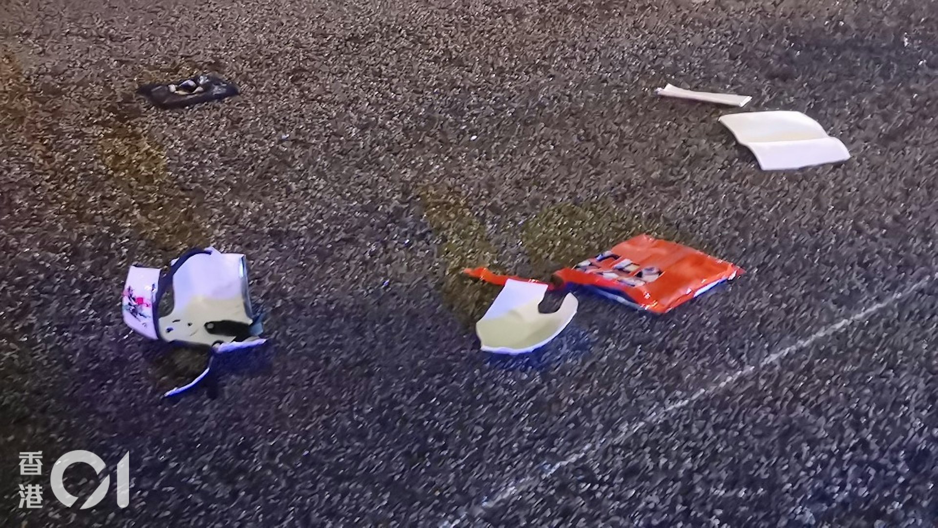 # k- i' I" F% o+ s# a; ~5 C& w' ]6 O: Z鐵騎士的電單車頭盔嚴重損毀,碎片散落一地。(林振華攝)公仔箱論壇/ K. n% ^0 c( `1 R U+ ?