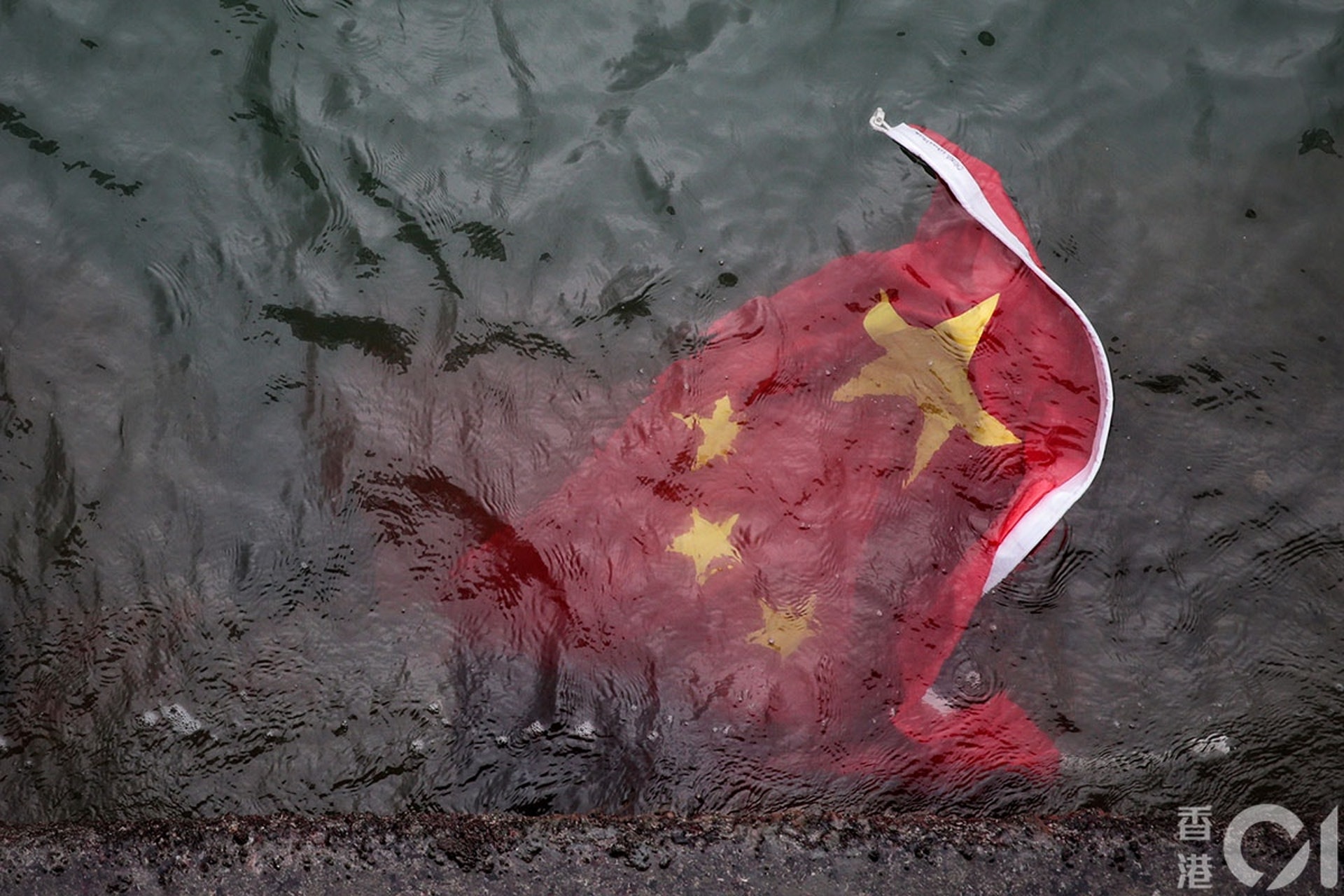 1 W: m! W' I/ k6 P公仔箱論壇8月3日示威者除下尖沙咀五支旗杆的國旗,並拋到海中。(資料圖片)