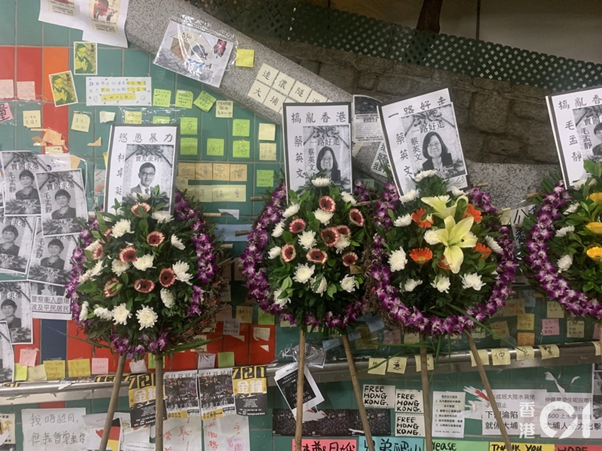 - D0 y6 m& q/ N# H& N5 L* g3 c公仔箱論壇有人在「連儂隧道」外擺放花牌,上面有幾名人士的黑白像,包括何韻詩、毛孟靜等。(賴南秋攝) |