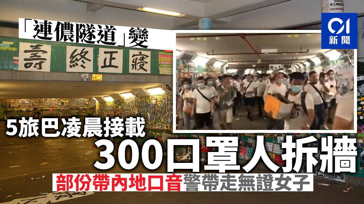 凌晨2時左右,有最少6輛旅遊巴突然駛至大埔墟火車站旁,逾300名身穿黑色及白色上衣的男女,部份人戴上口罩,走入火車站旁邊的的「連儂隧道」,隨即「分工合作」,部份人取來木梯,攀上隧道口並將寫有「連儂隧道」四字的大紙移除,隨之由左至右貼上「壽終正寢」四字取代。至於「信念拆不走」幾隻字仍然貼在隧道口上。tvb now,tvbnow,bttvb' ]2 t9 Q D0 J# S/ C# O+ x! j; X- z: T
