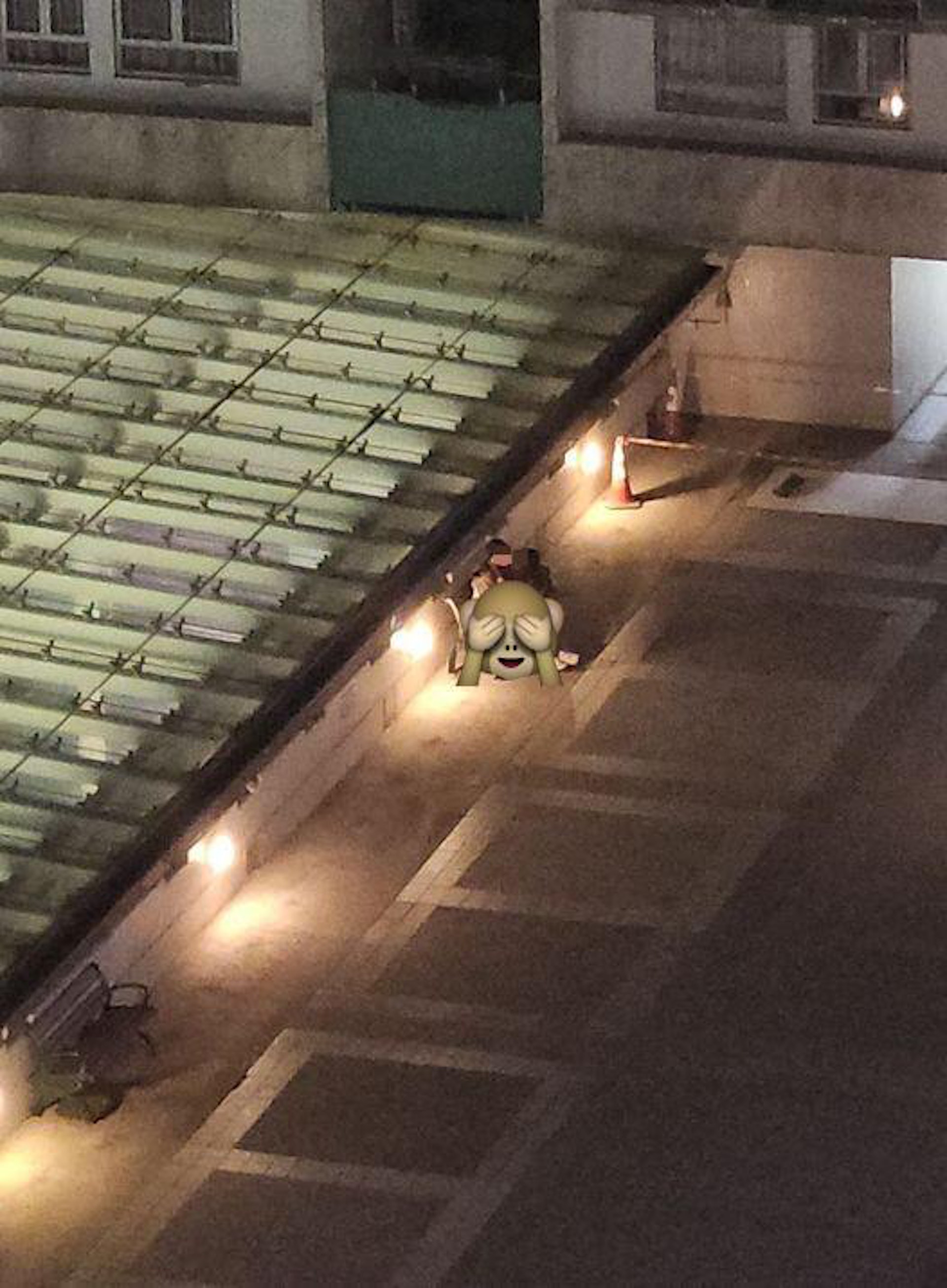 從相片見到,當時已經夜深,樓下戶外有1對穿着厚褸男女,其中男方坐在牆凳上,女方則坐在男方腳部上面,四周未見有人。