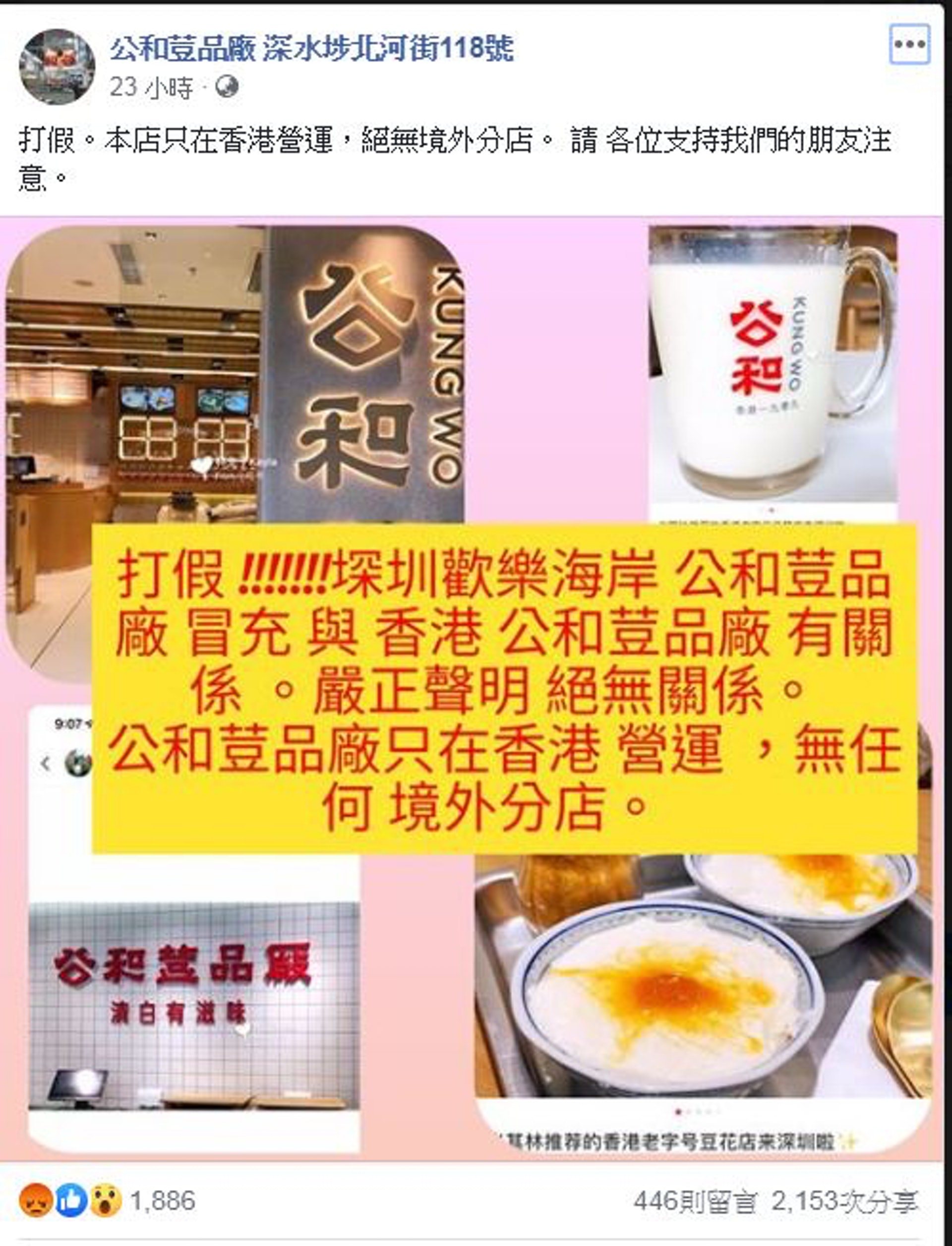 " B9 b( r" }2 Q, los.tvboxnow.com深水埗「公和荳品廠」嚴正聲明稱,有人冒充其店於深圳歡樂海岸開設分店。(深水埗「公和荳品廠」官方專頁截圖)os.tvboxnow.com( r, H g* h1 K3 P5 @( Q