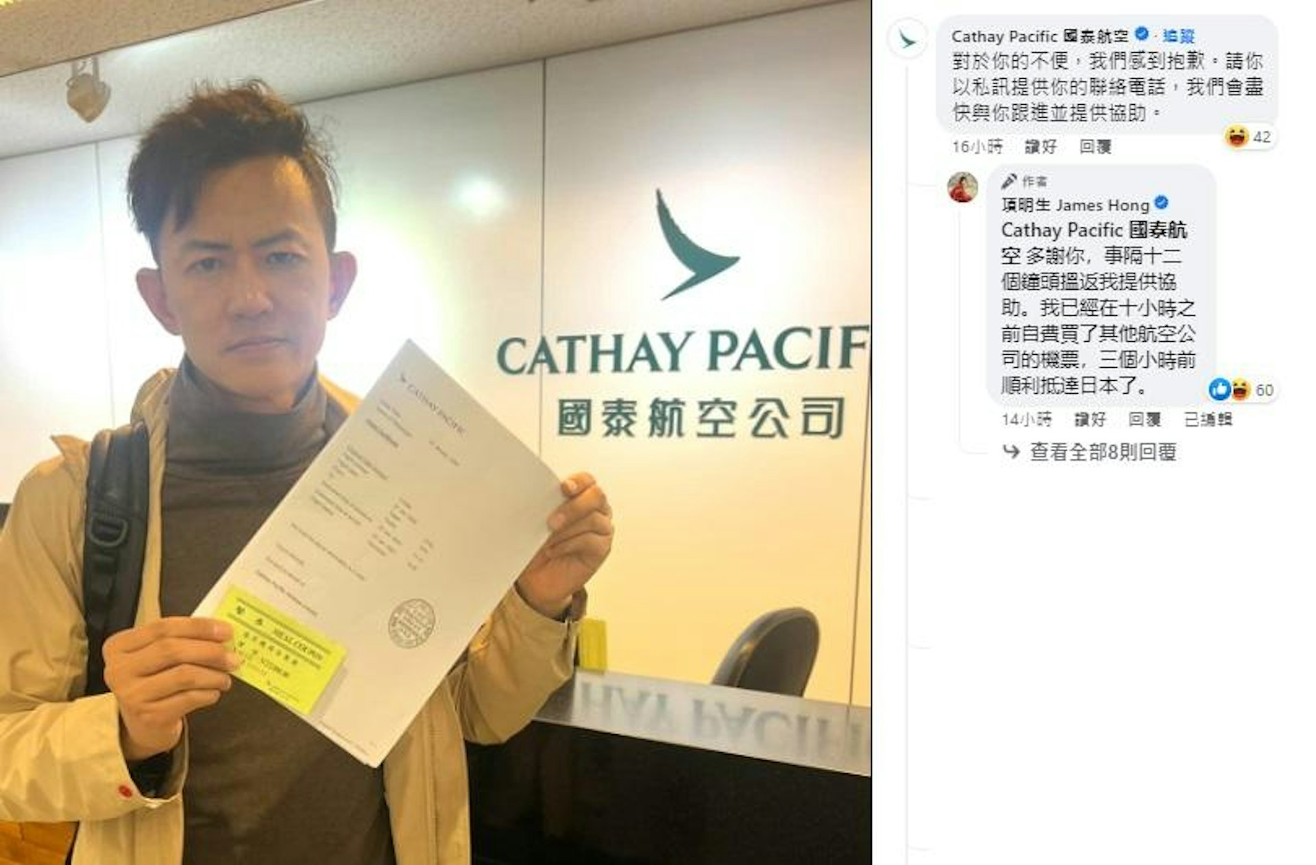 8 z. T! e4 R) i8 B3 V/ f( Q6 N公仔箱論壇國泰人工智能客服,在項明生發帖8小時後留言,請他私訊所需協助,項回答說已自費購機票。(項明生Facebook)