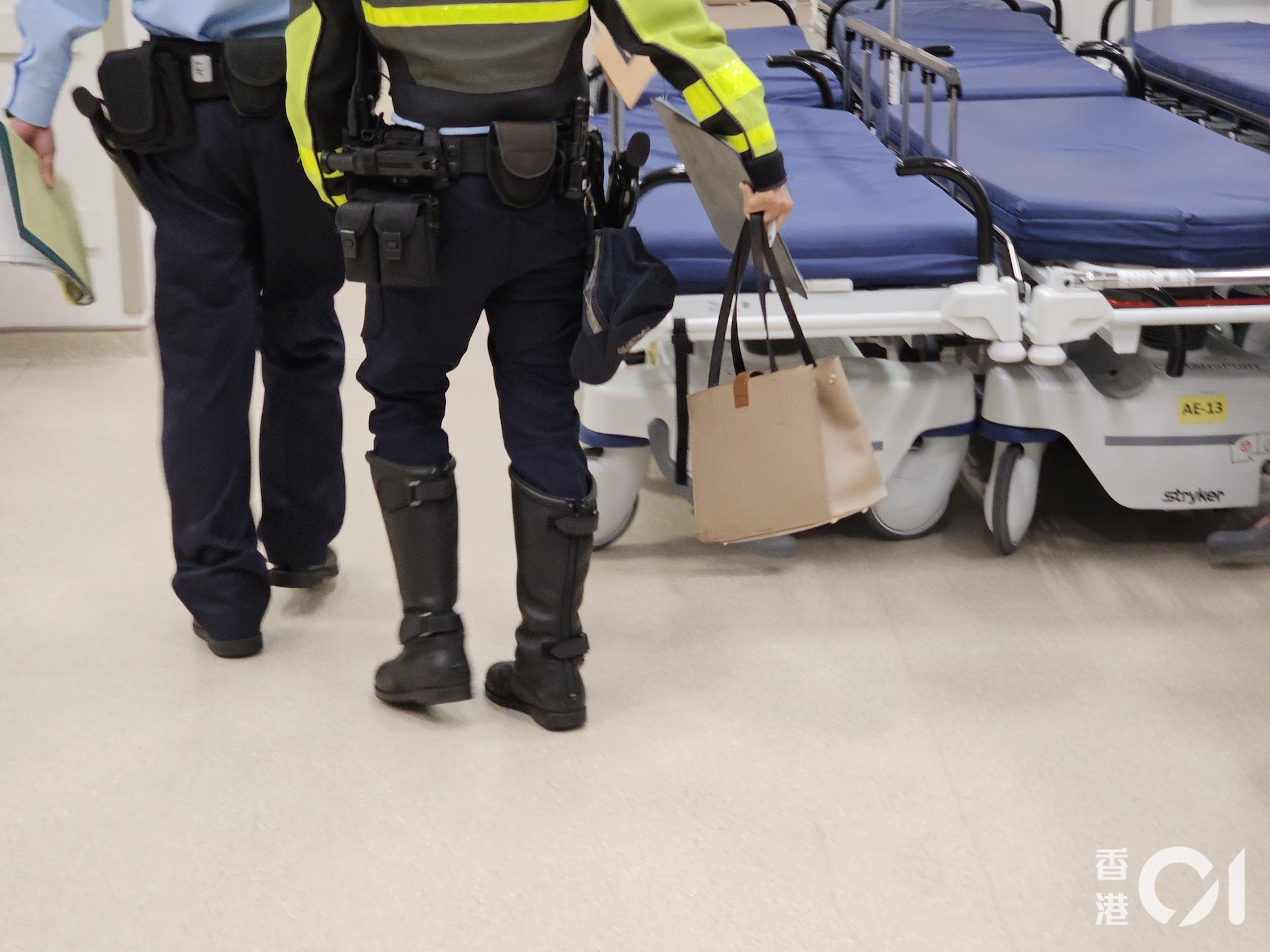 一名女子在觀塘駿業街與海濱道交界,遭一輛中型貨車撞到,昏迷送院,警員手持事主的手袋陪同她到醫院,手袋上沾有血漬。(梁偉權攝)os.tvboxnow.com9 V1 J- h% Z- j. |% J% G4 ~' K3 W