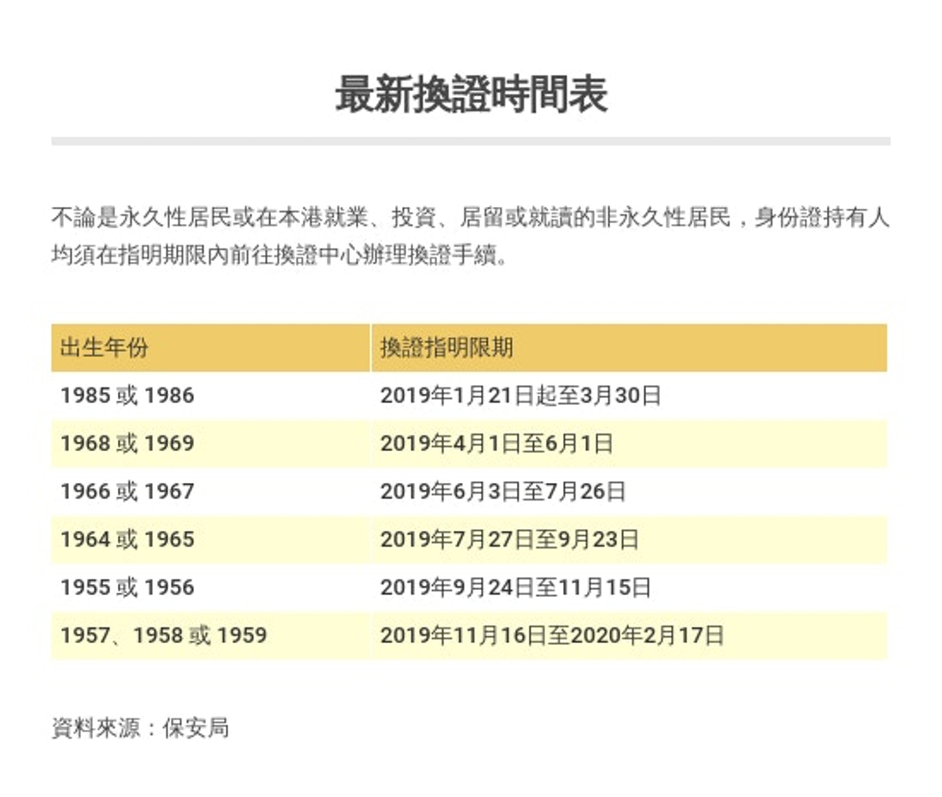 而6月3日起至7月26日的換證日期,只限於1966年或1967年出生的香港居民,入境處未來會繼續適時公布其他年齡組別人士的換證安排。入境處又提醒,於1968或1969年出生的現有身份證持有人,他們的指明換證限期將於今年6月1日完結。仍未辦理換證手續的人士應盡早提出申請,以免在限期最後一刻出現擁擠情況。