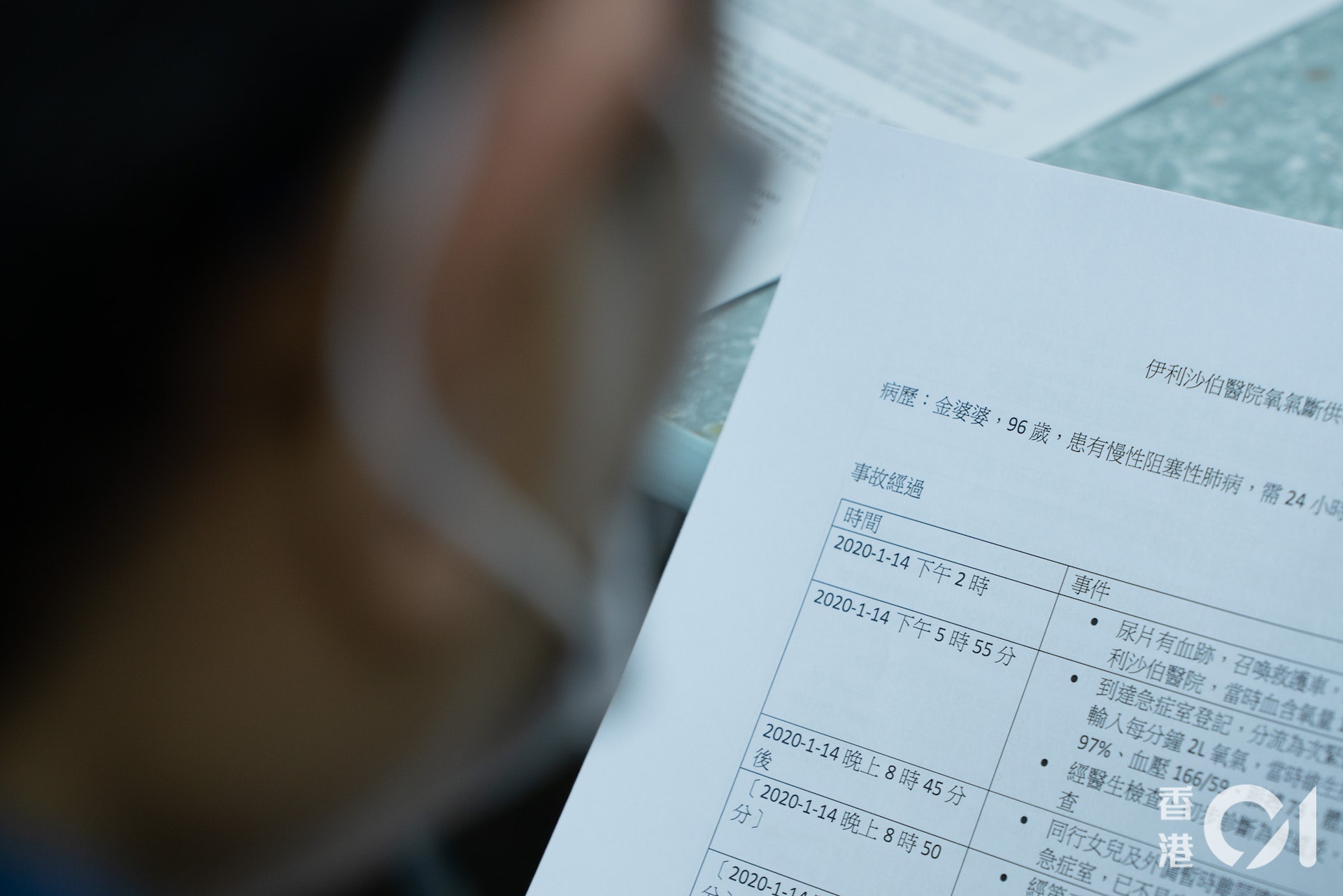 96歲金婆婆因慢性阻塞性肺病需要長期使用氧氣機協助呼吸,在2020年1月14日因尿片有血跡,女兒阿花(化名)決定召喚救護車送媽媽到醫院檢查。阿花憶述,到達伊院急症室後多次叮囑護士,其母親是需要氧氣供應;護士遂為金婆婆安排氧氣樽,以鼻導管輸入每分鐘2度的氧氣,幫助她呼吸。她與外傭亦一直陪伴在旁,過程沒有醫護前來檢查氧氣樽,而當時金婆婆未有異常,血含氧量當時為97%。