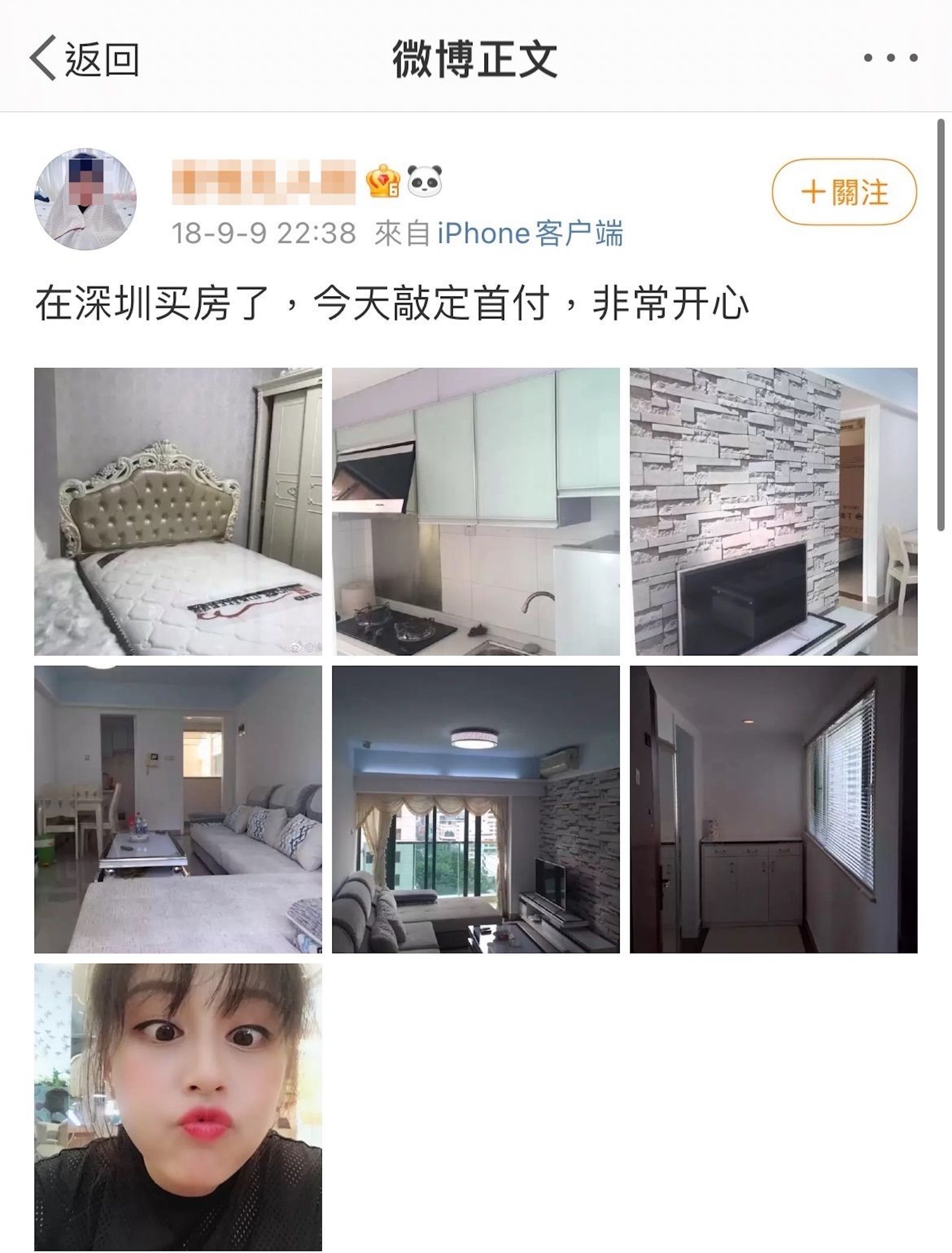 7 }- D7 f5 N& `+ Q' g* nos.tvboxnow.com另有網民找到靚媽2018年的微博,她表示以400萬元購入位於深圳的單位。(影片截圖)os.tvboxnow.com# z, k$ E" j3 d: B2 T) K5 G
