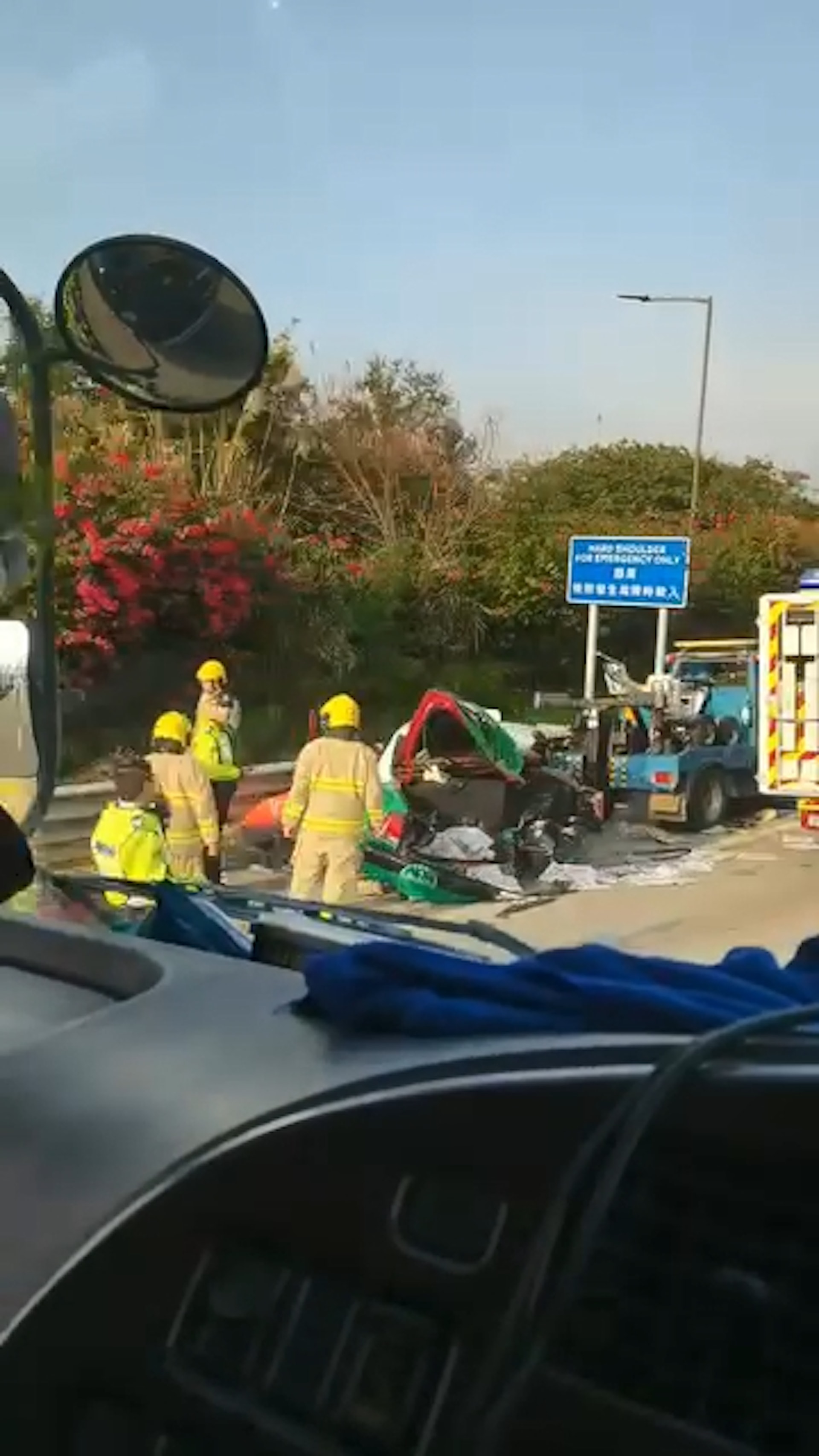 元朗公路一輛的士停在路肩換胎期間,一輛貨車收掣不及猛撼的士,將的士推至撞上前方另一輛拖車,的士嚴重損毀,現場遺下大堆雜物。(林振華攝)