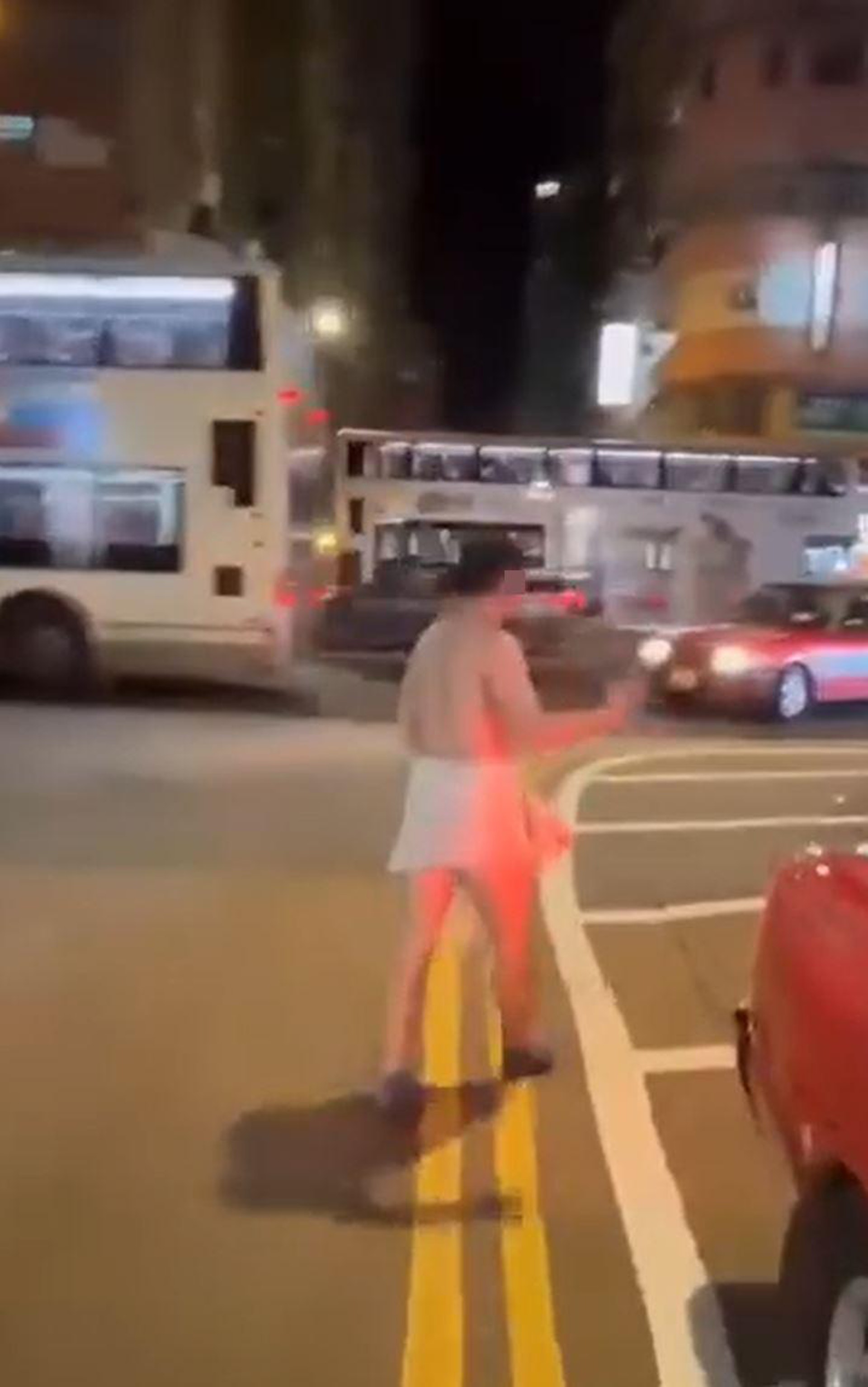 半裸男唯有沿花園街轉彎走到亞皆老街,再過馬路前往洗衣街。(網上影片截圖)