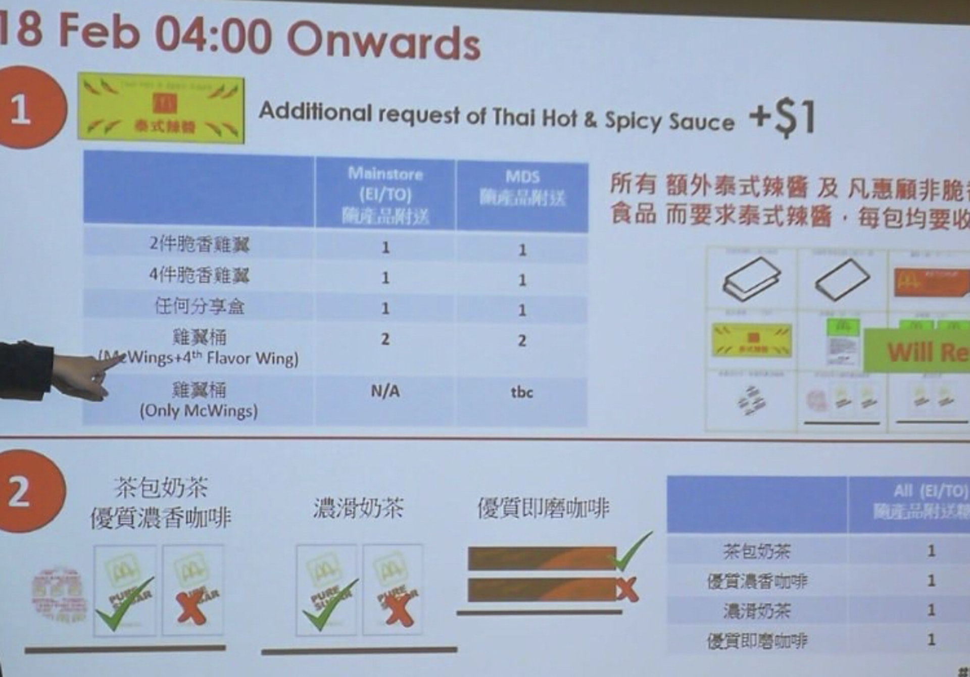 $ j5 |$ S# R+ ]" ~- ~近日網上流傳一張相片,雖然未有提及拍攝地點,但內容圍繞麥當勞派發配料的「新指引」。相片中顯示出一張幻燈片,當中列出一個表格,指在2月18日凌晨4時開始,除了隨餐附送的泰式辣醬外,顧客額外要求的辣醬將會被收取1元;而熱飲附送的糖包亦將由兩包改為一包。