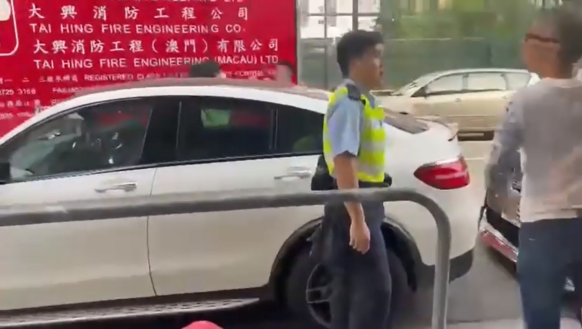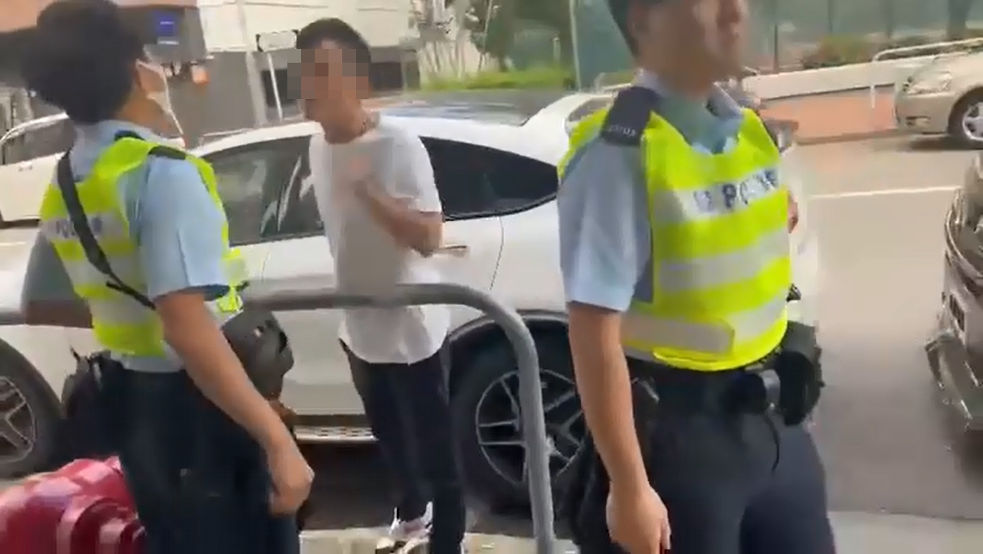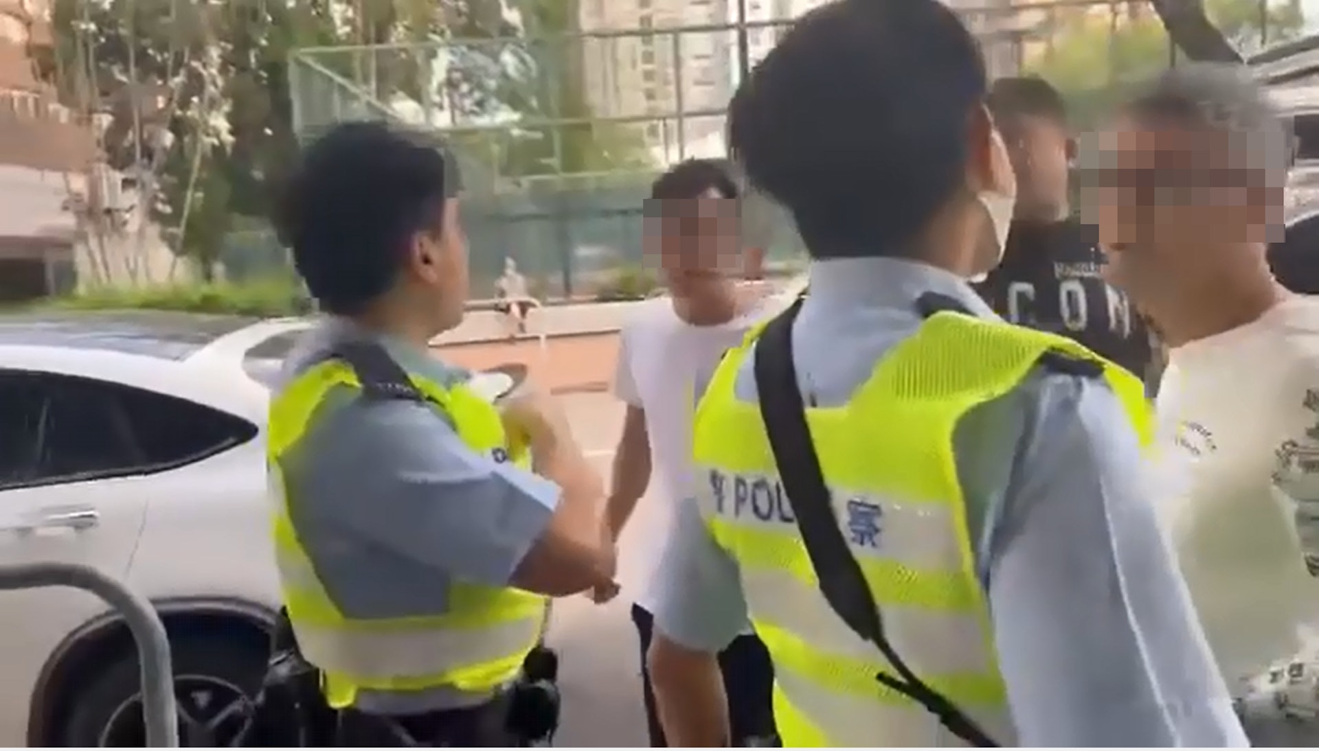 / F. L, ?2 c9 R& ?交通警票控完畢後,和勝和「姑爺偉」等3名男子繼續指罵警員,另外1人則在旁用手機拍攝錄影。(網上片段)
