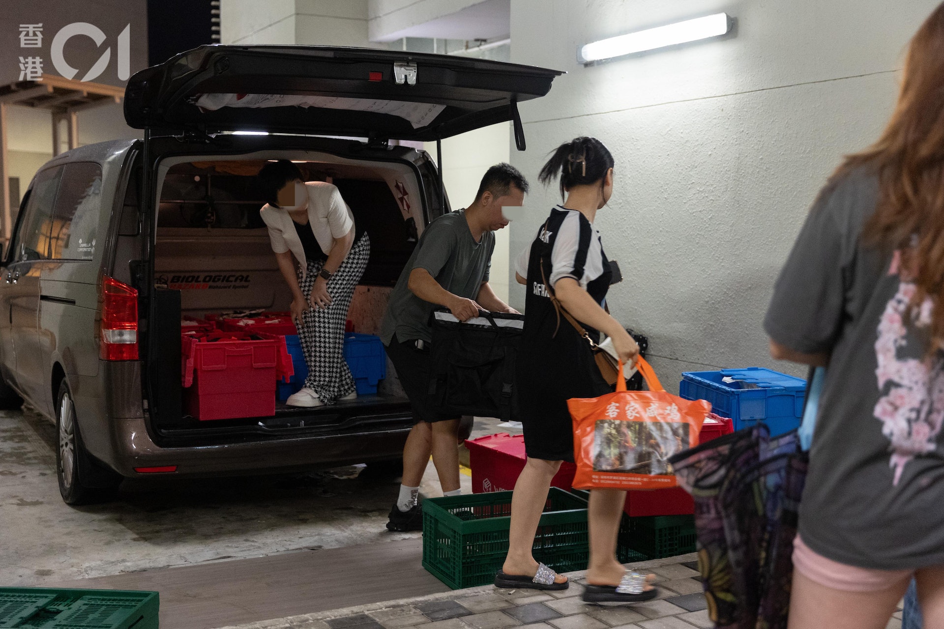 運送跨境外賣的客貨車,每晚準時駛到粉嶺皇后山邨皇順樓地下,司機分派外賣予居民。(林靄怡攝)