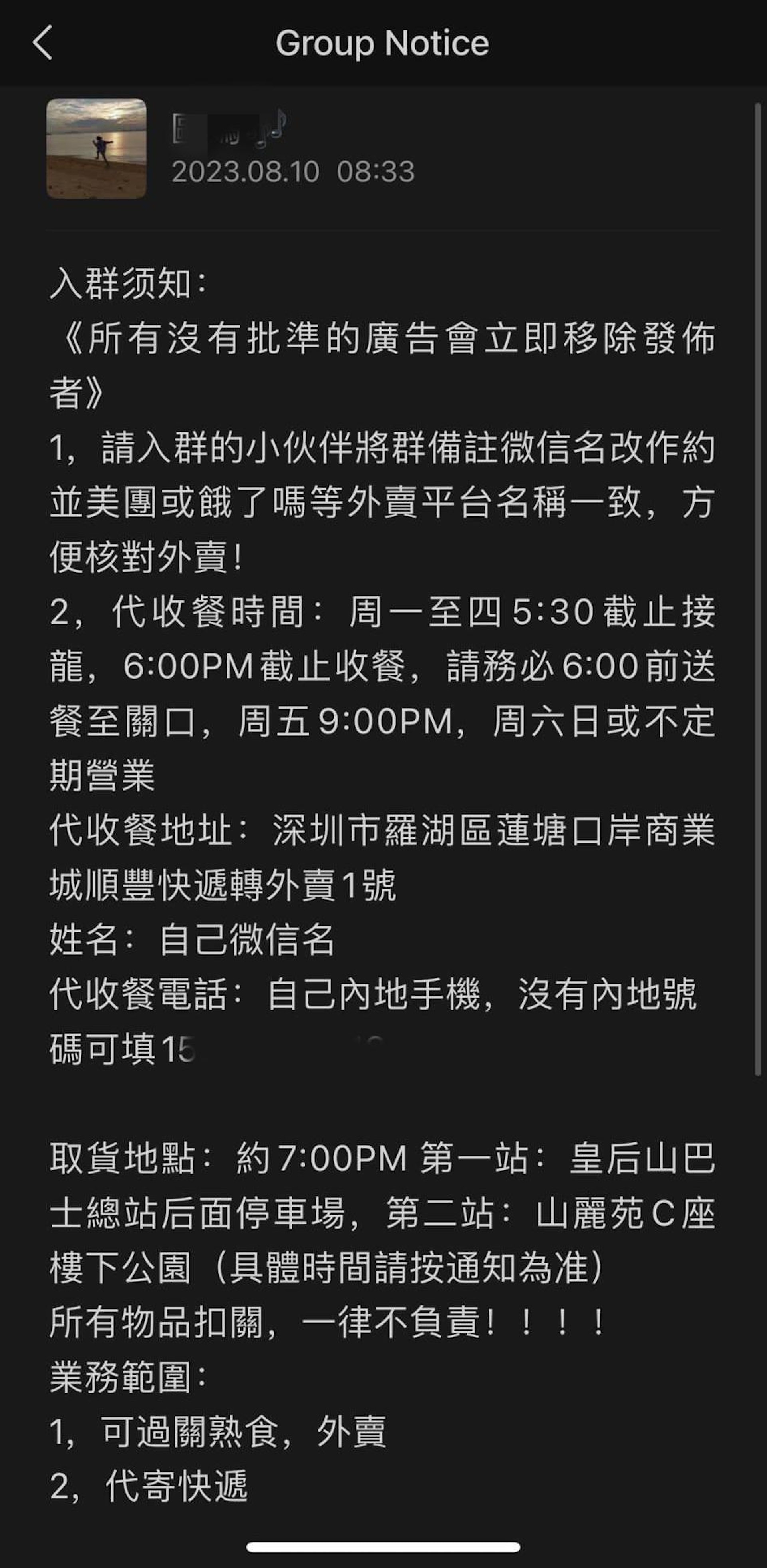 社交平台充斥大量逆向代購宣傳帖文,提供收費「跑腿」服務,可代買及代取內地外賣食物回香港交收。(小紅書圖片)os.tvboxnow.com3 N Z$ L. |8 T& v1 p' v- M0 o