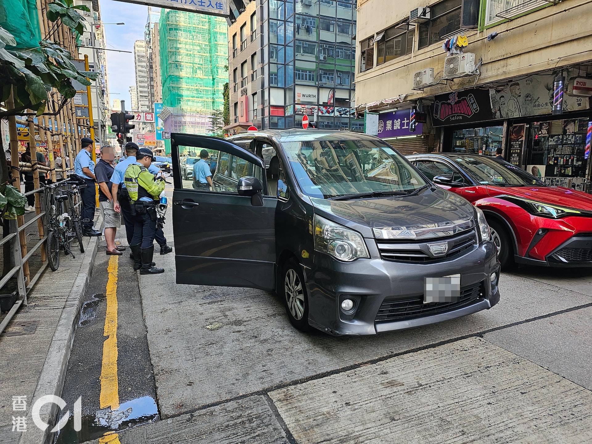 一輛七人車今日(10日)下午在旺角山東街和廣東道交界撞到4名途人,涉事司機在場接受調查。(梁偉權攝)5 h4 {/ t: l1 M8 ]