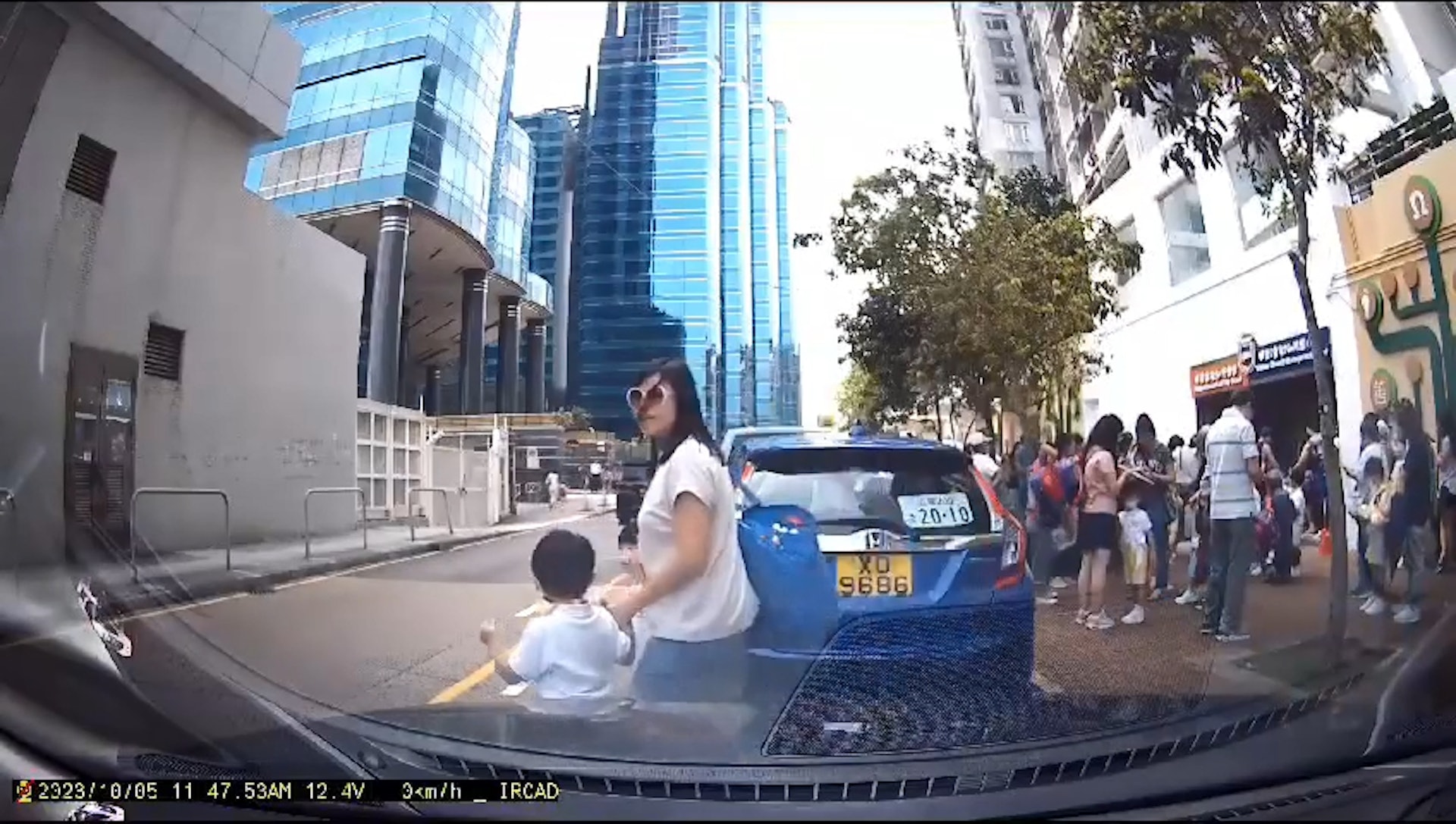 - K, M! n- \5 a3 I- N6 N公仔箱論壇涉事母親拖着一對子女步出馬路,其間一邊望向左方查看是否有車駛至。(網上片段截圖)