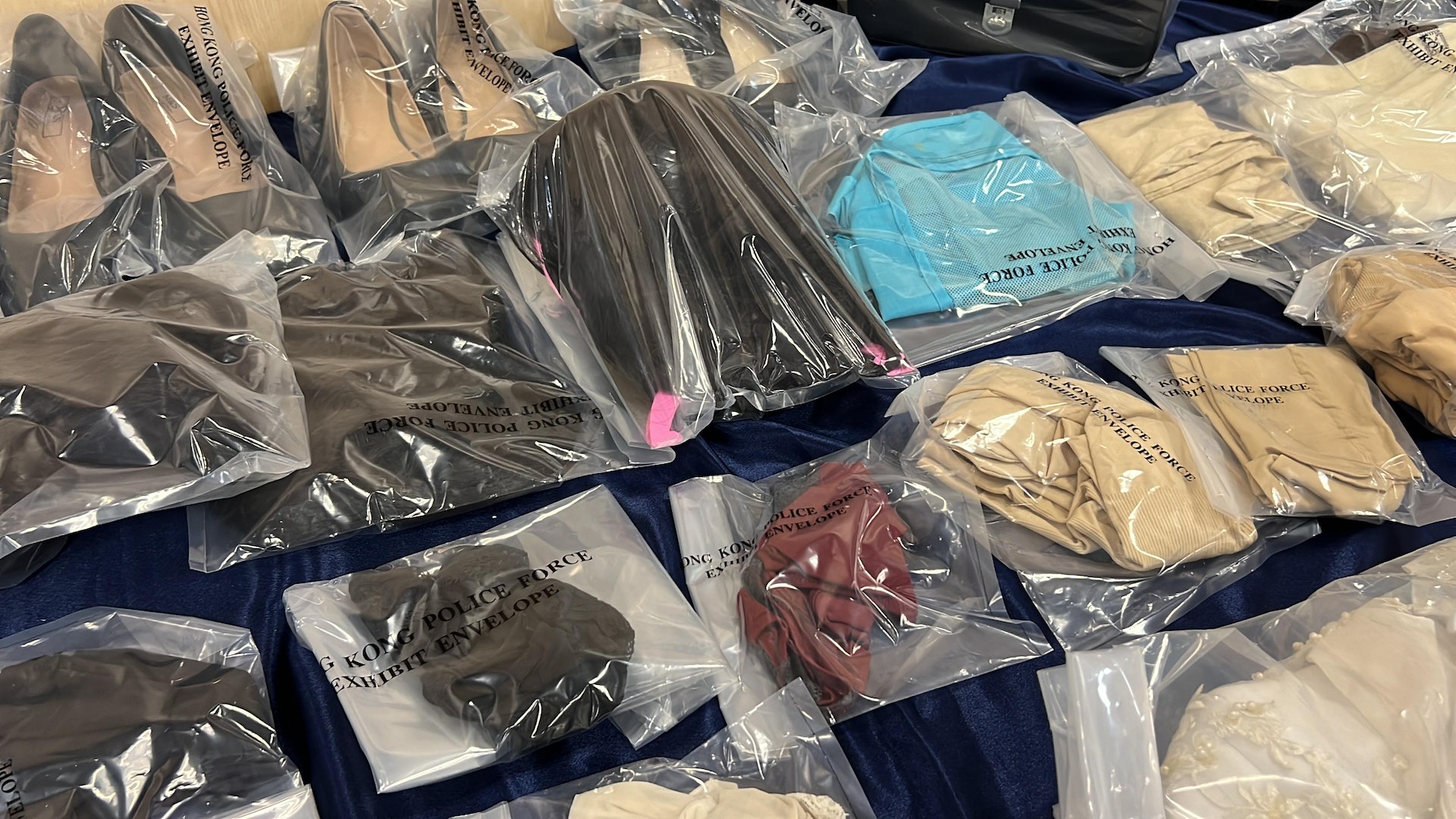 警方檢獲的證物,包括女校校服、黑色絲襪及化妝品等。(翁鈺輝攝)